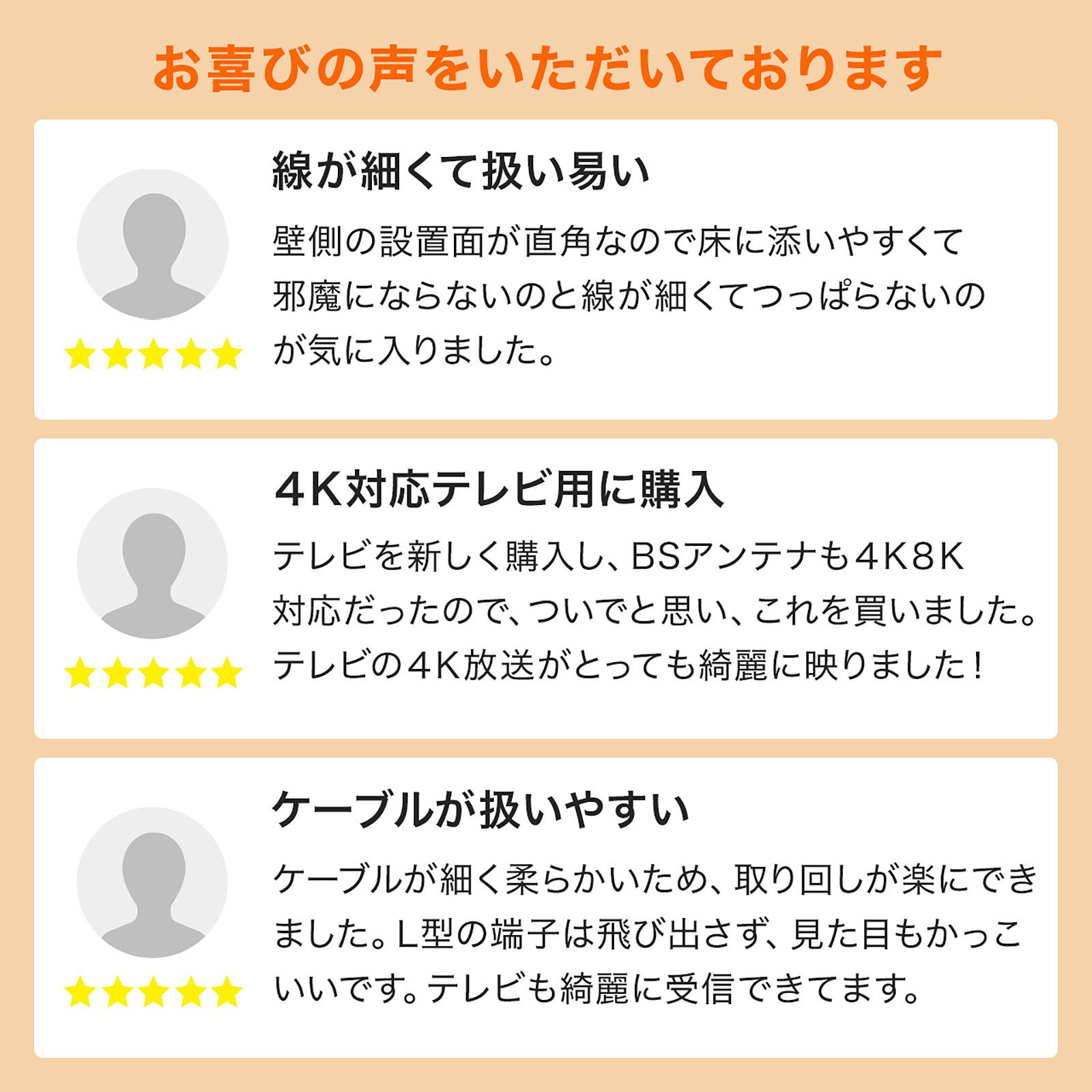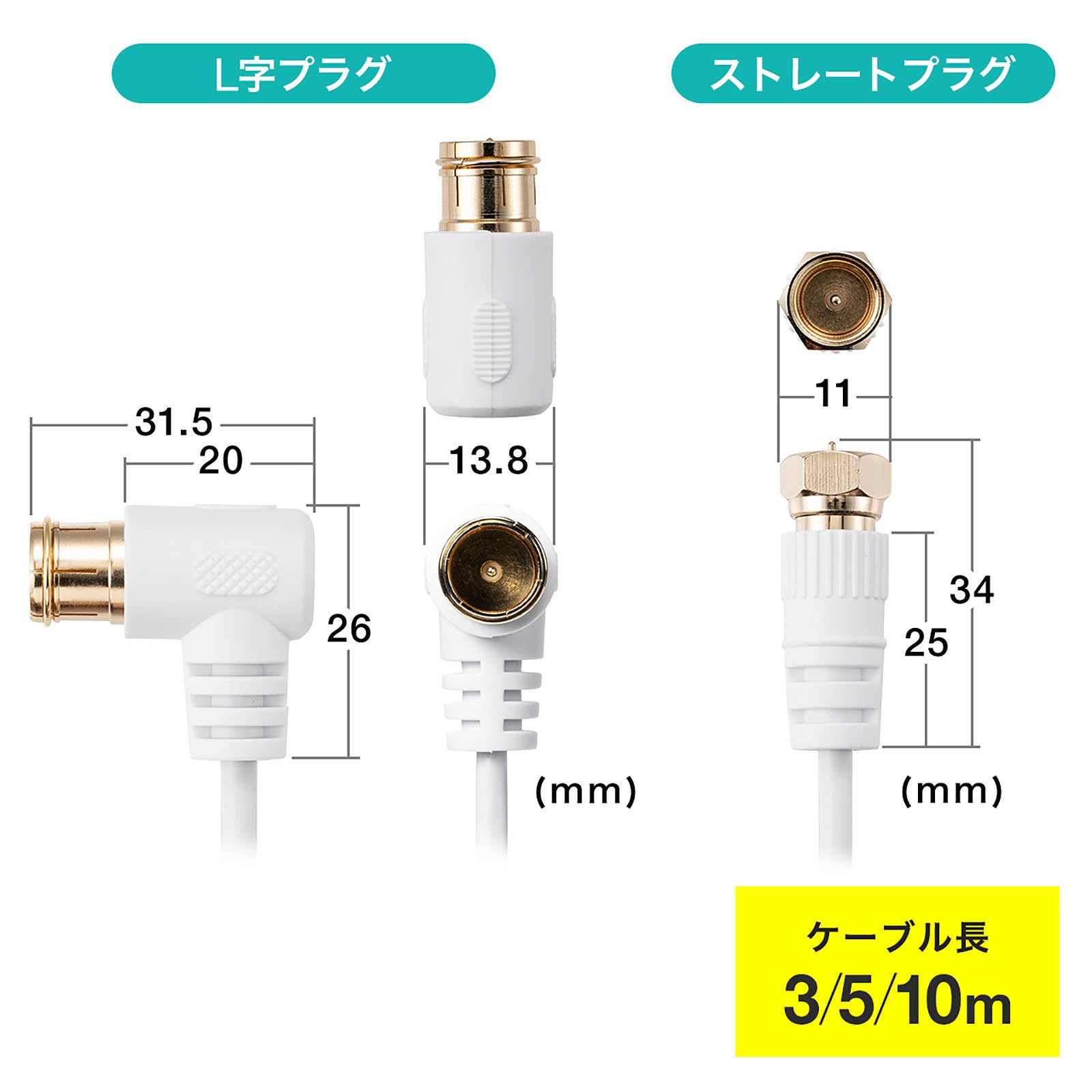 アンテナケーブル 極細 4K対応 8K対応 S2.5C 片側L字 ねじ式 アンテナコード 同軸ケーブル ホワイト(3m、5m、10m)