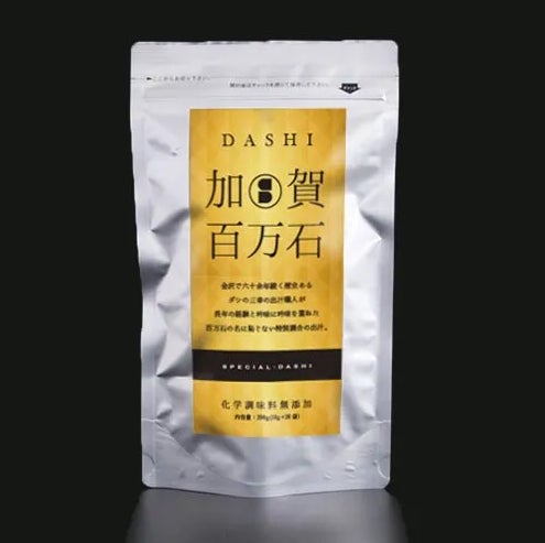 まぐろ節を中心にブレンドした味噌汁・煮物・鍋など幅広い用途でお楽しみいただける黄金色の「加賀百万石のお出汁」と、いわし煮干しを中心にブレンドした風味豊かな素朴で懐かしい味の「能登島のお出汁」に、「飛魚だし塩」を加えた3点のお得なセットを5,500円(税込)で1日10セット販売いたします。