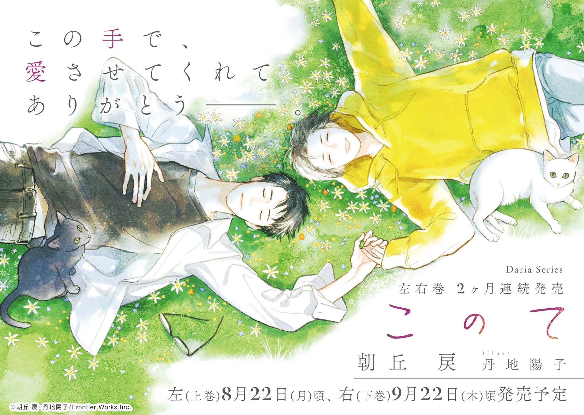 株式会社フロンティアワークス(アニメイトグループ)は、大人気BL小説家 朝丘 戻先生の待望の新作BL小説「このて」の右巻(下巻)を発売いたします。数々の書籍で挿画を手掛ける丹地陽子先生を迎え、左右2巻の大ボリュームでお届け。朝丘 戻先生デビュー20周年記念フェアもコミコミスタジオにて開催中!