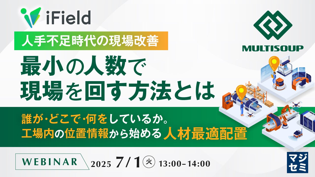 本セミナーでは、マルティスープが提供する革新的な位置情報活用プラットフォーム『iField』を活用し、製造業の現場の作業状況の把握や人員配置における課題解決策をご紹介します。