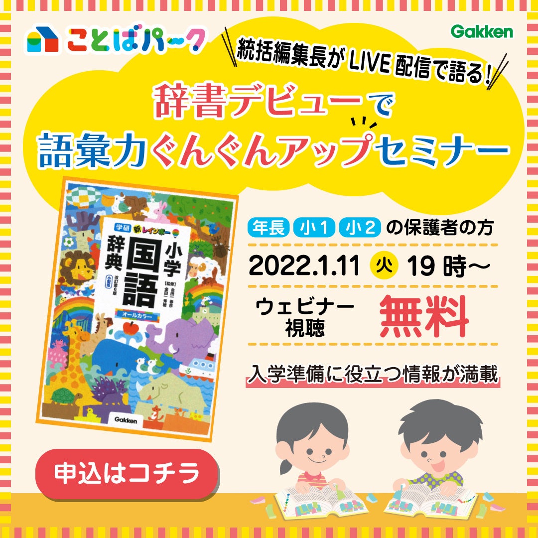 小学校の入学を控えたこの時期、お子さまの辞書選びはどうされていますか? 「はじめての辞書」を選ぶなら、”今”がベストタイミングです! そこで、学研のオンライン講座である「ことばパーク」では、安心して小学校入学を迎えるためのオンラインセミナーを企画しました。