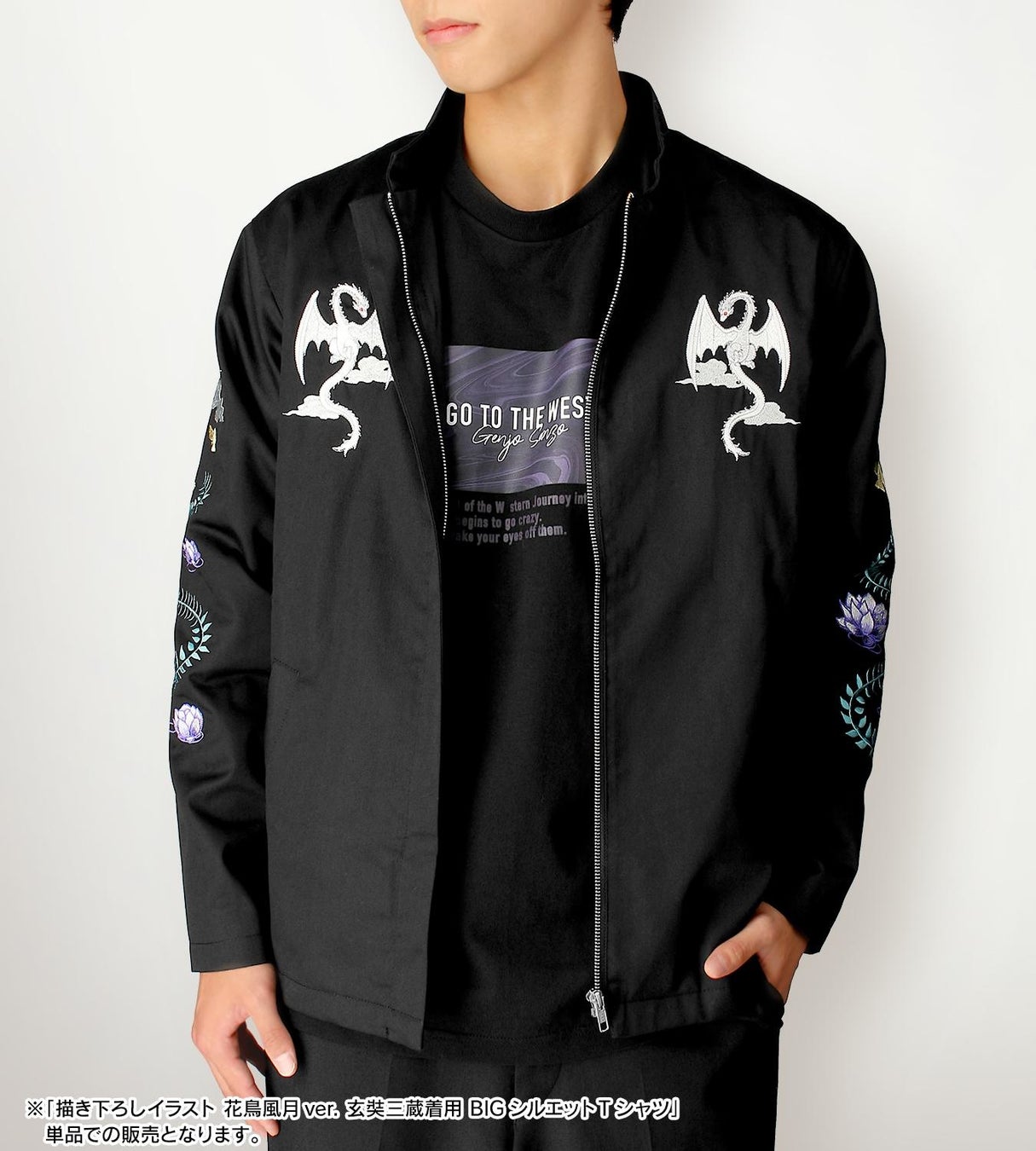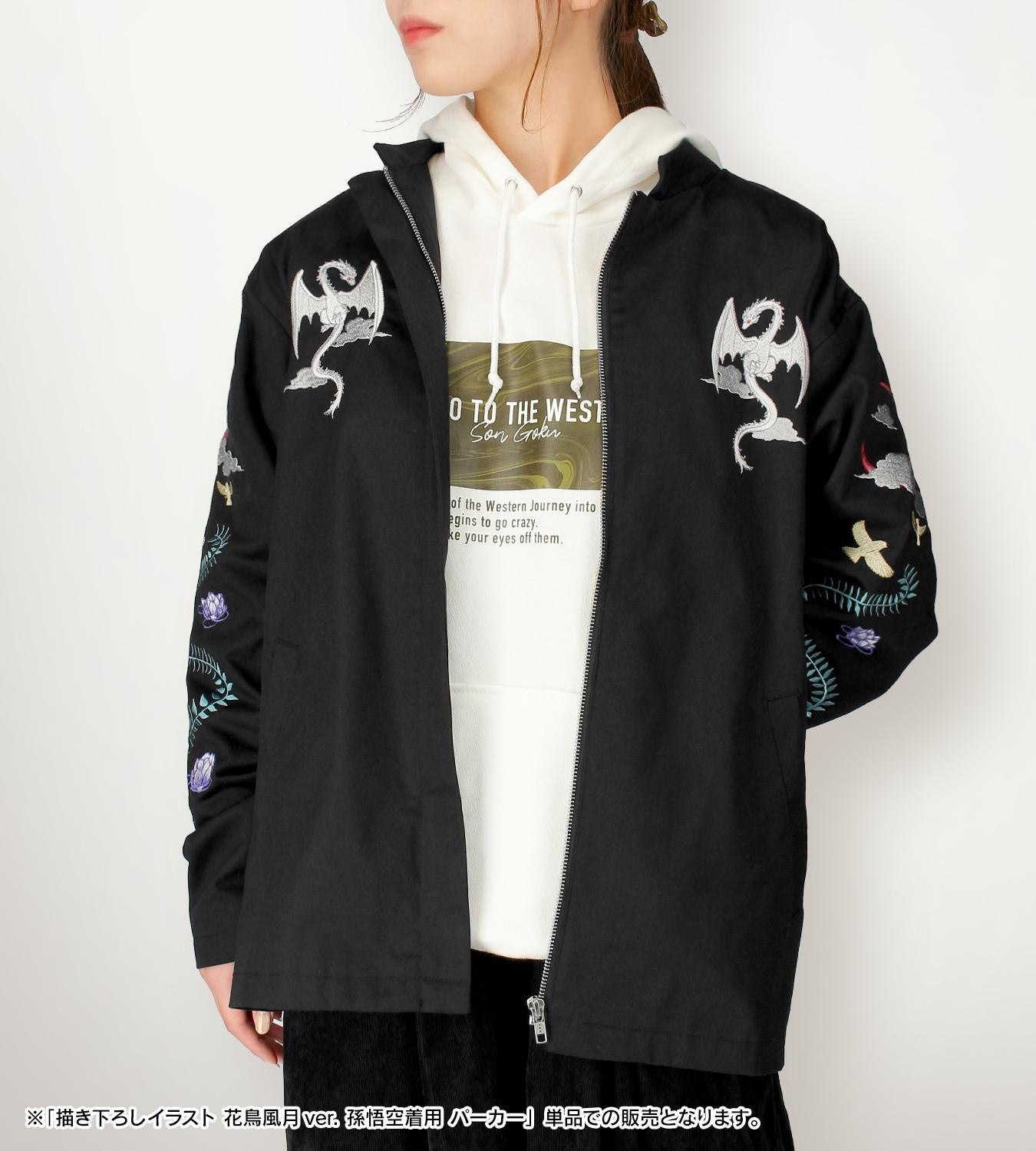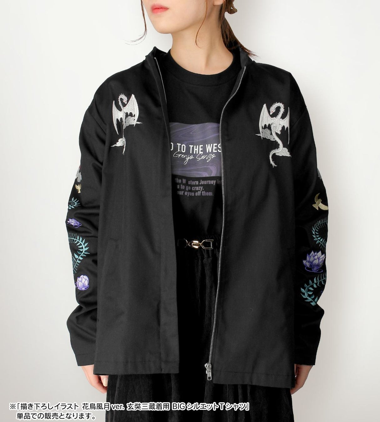 両腕には花鳥風月に擬えて蓮の花、岩牢に現れた小鳥、猪八戒の蔦模様、錫月杖のモチーフをレイアウトし、胸元には白竜を描き起こしたものを刺繍で施しました。薄手で重ね着がしやすく、オールシーズンでお使いいただけるアイテムです。