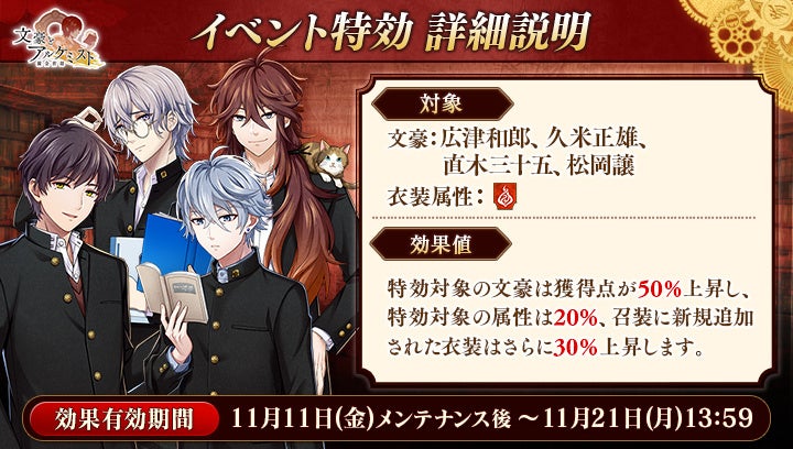 期間中「広津和郎」「久米正雄」「直木三十五」「松岡譲」の衣装を編成して潜書すると、得点の獲得数がそれぞれ50%上昇します。また、「火」属性の衣装を編成して潜書すると、得点の獲得数がそれぞれ20%上昇します。