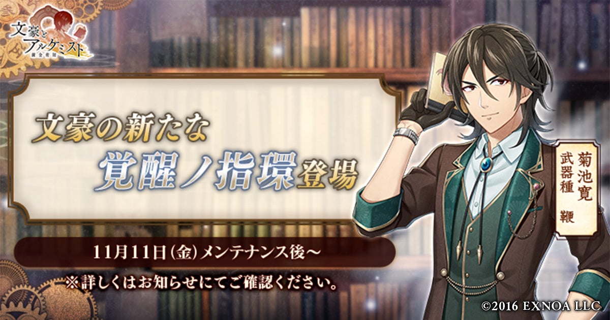 合同会社EXNOA(本社:東京都港区、CEO:村中 悠介、URL:https://games.dmm.com/)が運営するDMM GAMESは、11月11日(金)より、女性向け文豪転生シミュレーションゲーム「文豪とアルケミスト」において、菊池寛の新たな「覚醒ノ指環」が登場いたしました。