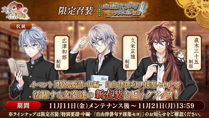文豪の「衣装」や、会派に装備する事で能力を強化できる「装像」などが入手できるコンテンツ「召装」に、限定召装『特別要請-中編-「自由律俳句ヲ採集セヨ」』が期間限定で登場します。この召装では、イベント『特別要請-中編-「自由律俳句ヲ採集セヨ」』で活躍する「広津和郎」「久米正雄」「直木三十五」の新衣装を一定の確率で入手できます。