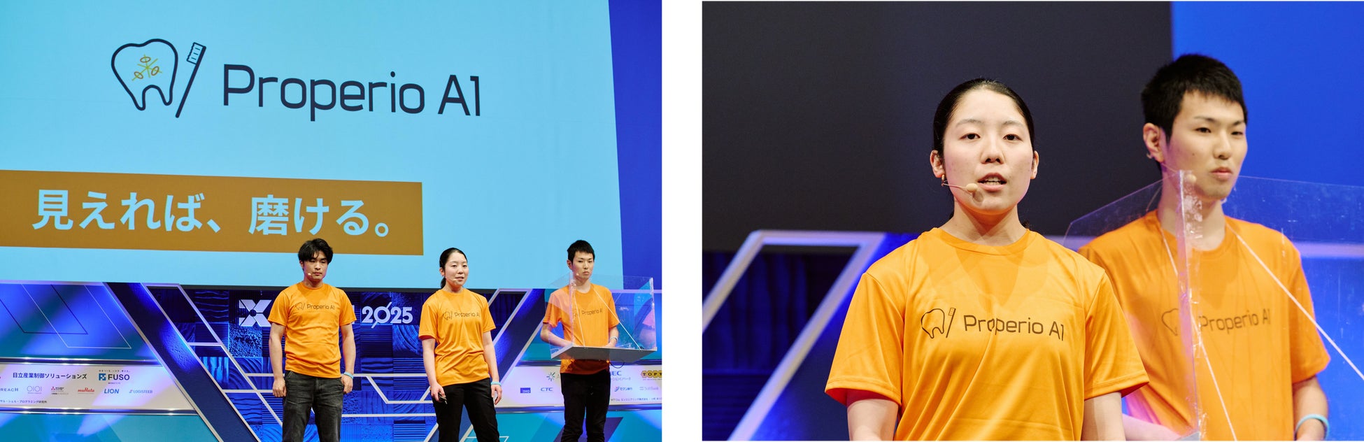 作品概要:「Properio AI」は、ブラッシングの傾向を手軽に把握し、歯周病予防につなげるシステムです。歯周病は、日本の50代の約半数が罹患しており、進行すると歯を失う大きな原因となります。本作品は深層学習を活用し、歯周病のおもな要因である「不十分な歯磨きによる磨き残し」を解消するため、磨き残し箇所を推論して可視化・記録するシステムです。このシステムを利用することにより、日々のブラッシング習慣を見直し、口腔内の健康維持に貢献します。