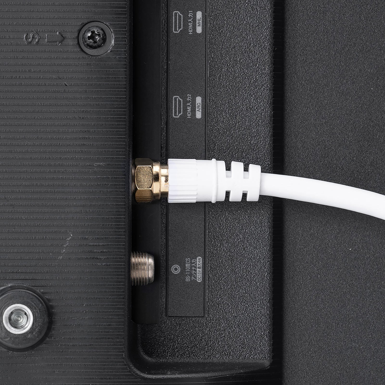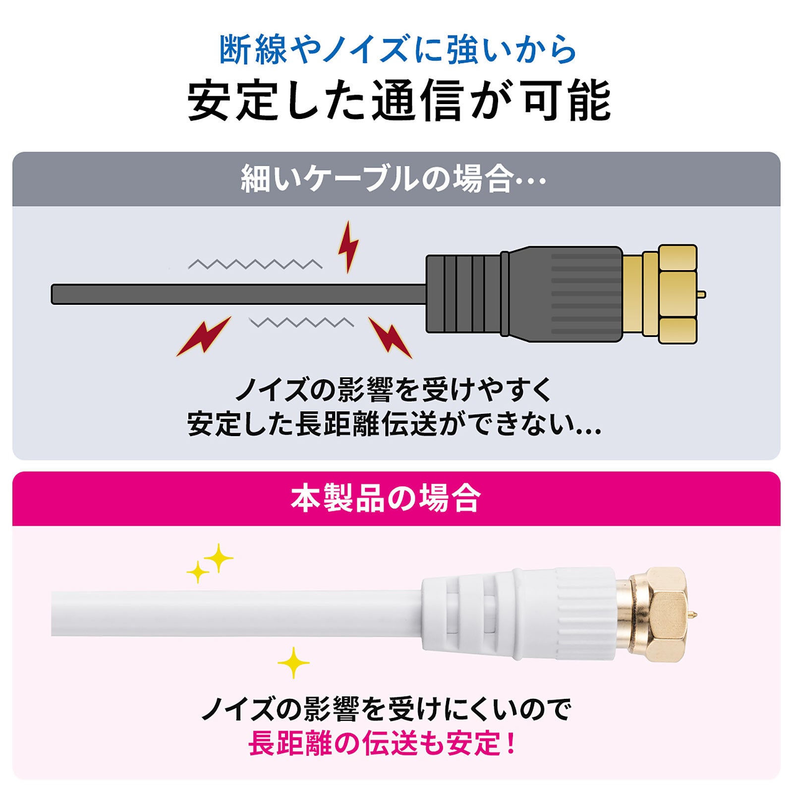 本製品は、S-4C-FB規格で、BS新4K/8K・CS・デジタル放送に対応した低損失の線材に映像用高周波75Ω同軸ケーブルを採用しています。直径約6mmなので、断線やノイズに強く安定した通信が可能です。片側はL字/差込式、もう片側はストレート/ネジ式のテレビアンテナケーブルです。