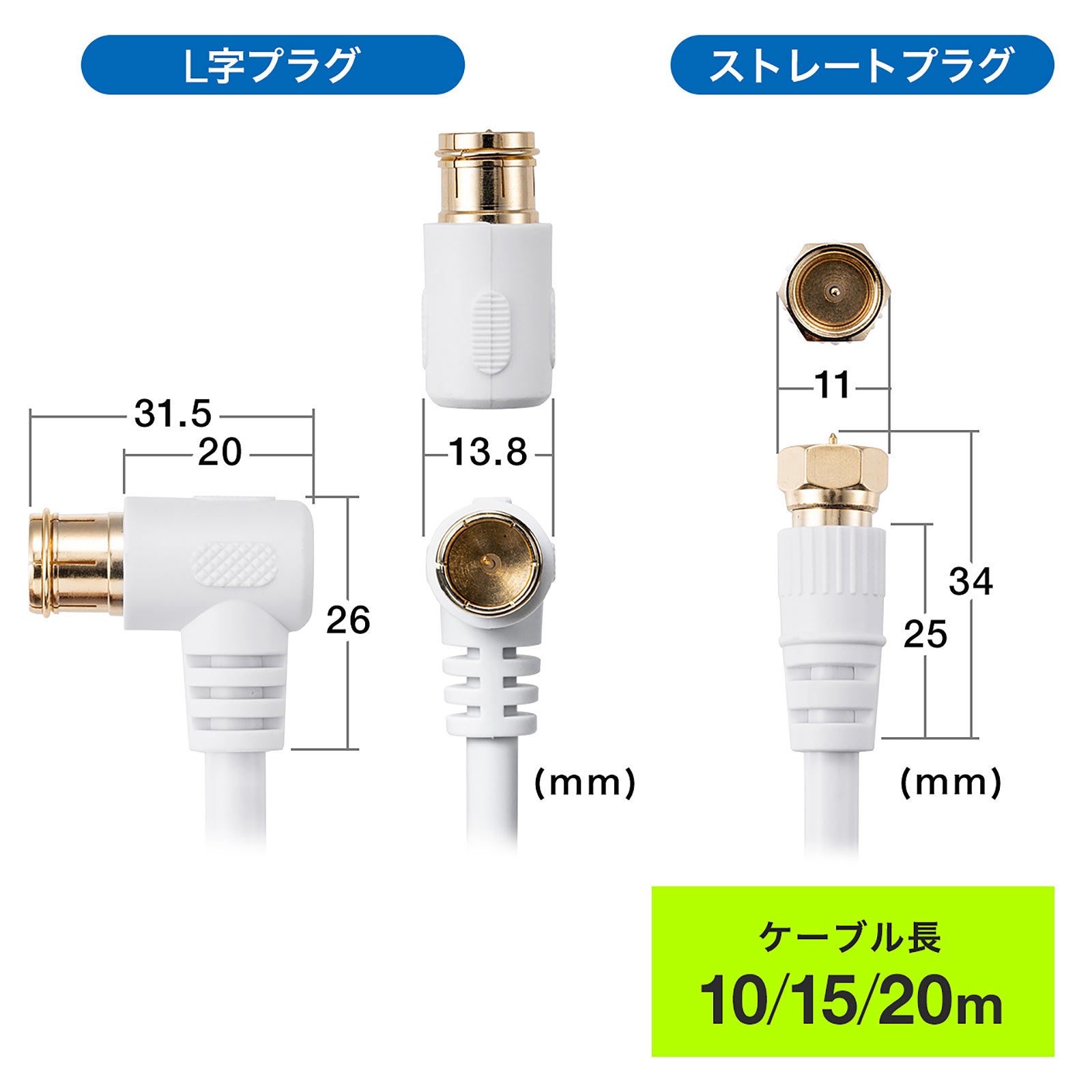 アンテナケーブル 4K対応 8K対応 S-4C-FB 片側L字 ねじ式 アンテナコード ホワイト(10m、15m、20m)