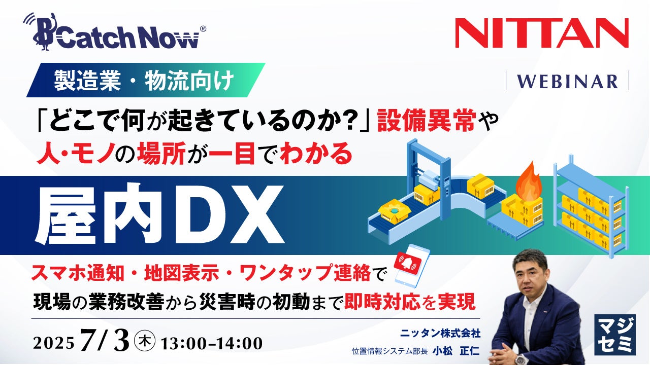 本セミナーでは、屋内での人物・モノの位置情報や設備の異常をリアルタイムに可視化する屋内位置情報システム「BCatchNow」についてご紹介します。