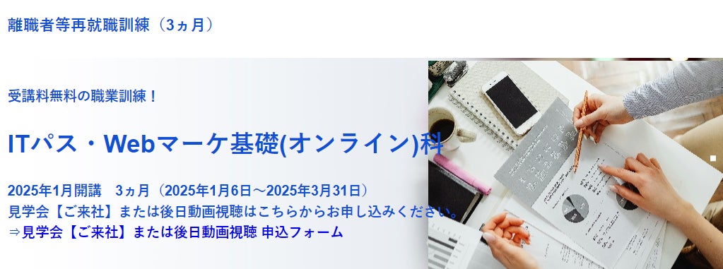 離職者等再就職訓練「ITパス・Webマーケ基礎(オンライン)科」(1月開講・3か月訓練)