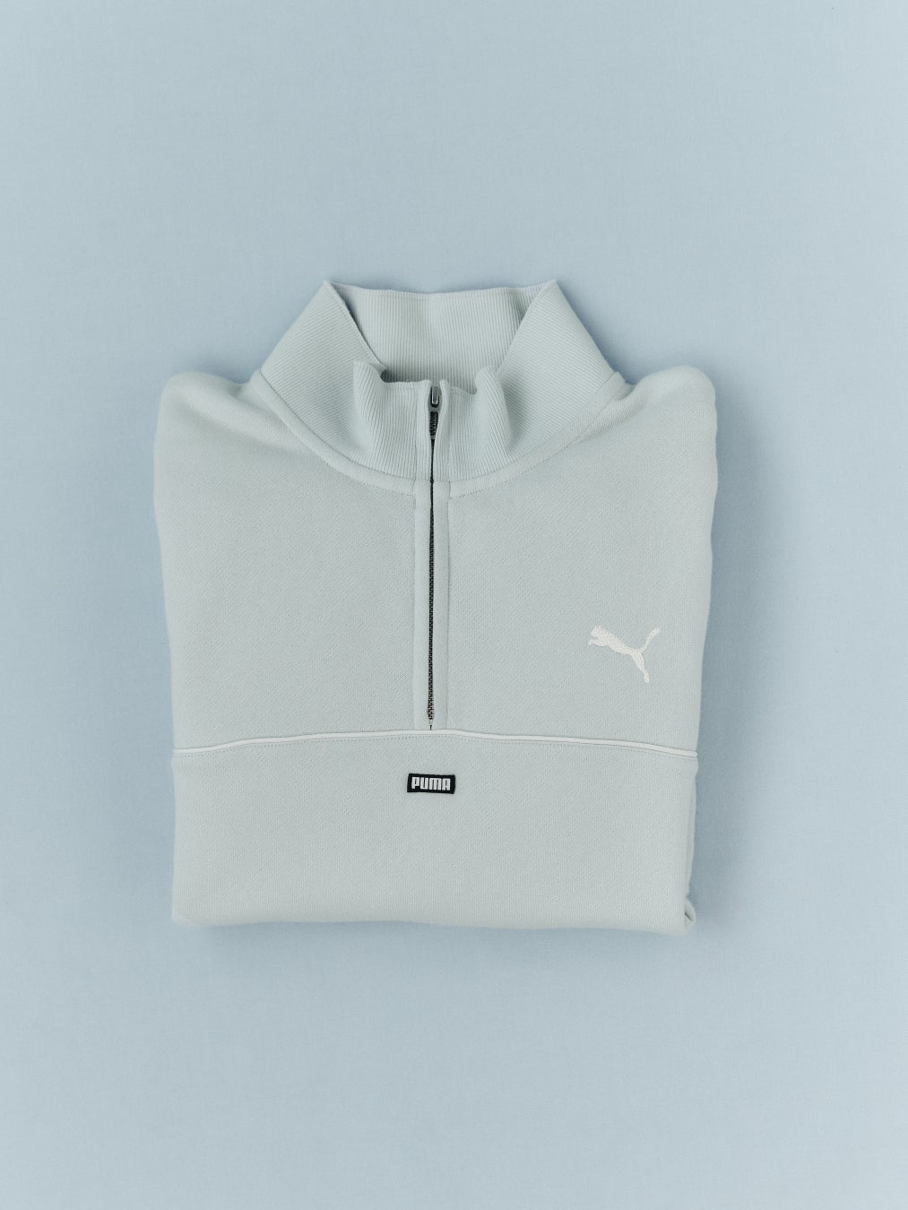 肉厚で裏起毛のスウェット生地で暖かく、ハーフジップとスタンドカラーで顔回りをすっきりと演出。