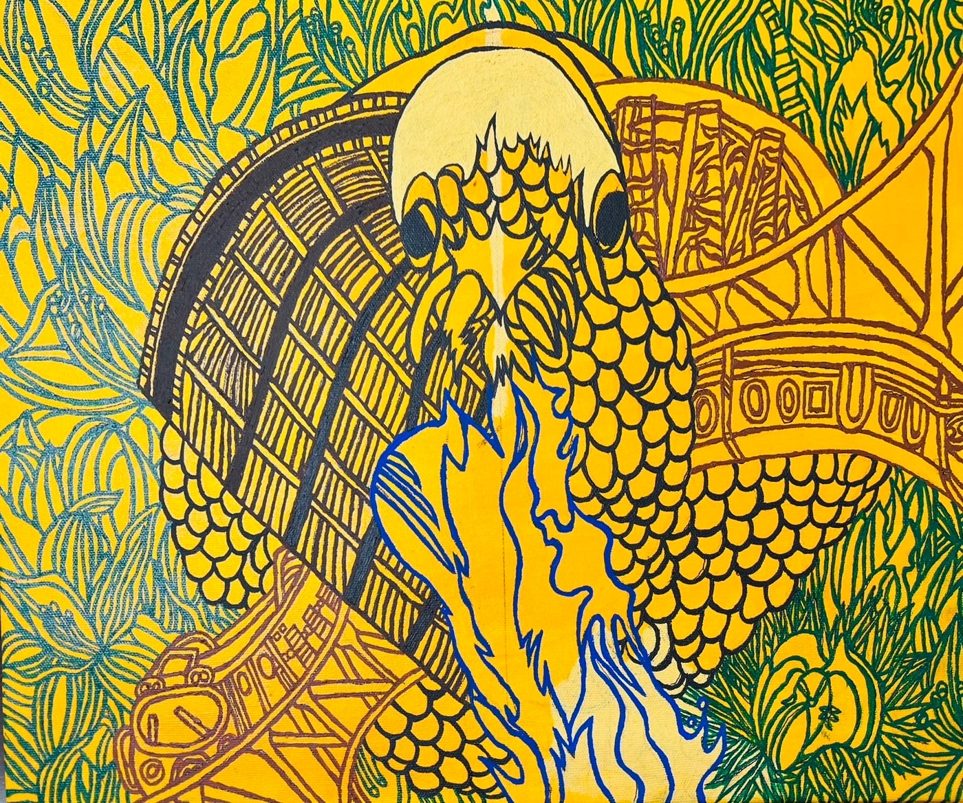 「ホームタウン」富山展ではジミー大西が富山開催のために富山をモチーフにした新作を鋭意描き下ろし中です。富山県鳥のライチョウを中心に黒部ダム、チューリップ、トロッコ電車などが描かれており、還暦を迎えてもなお新しい作風に貪欲なアーティスト・ジミー大西の熱意が感じられる作品となっています。