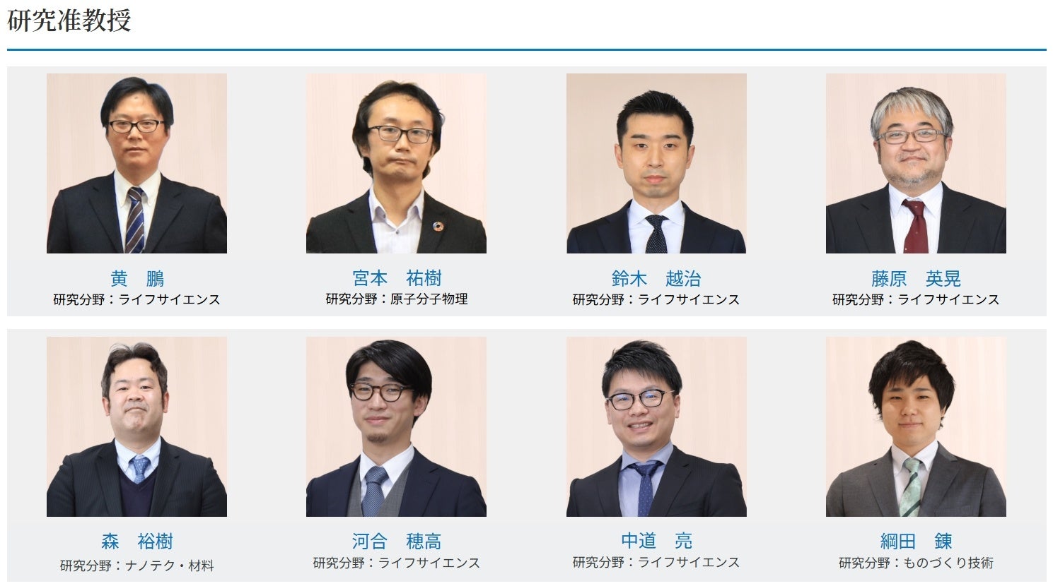 岡山大学では、研究力強化促進と若手研究者育成などの観点から、優れた研究業績を有する研究者の全学を挙げた支援を実施しています。その支援のひとつとして、「准教授」が独立した研究代表者(PI:Principal Investigator)として活躍することを促進するため、「研究教授」の称号と研究費配分や研究活動の充実などのインセンティブを付与する「研究教授」制度を2018年度から実施しています。また、2020年4月からは、講師と助教を対象とした「研究准教授」制度を実施しています。
