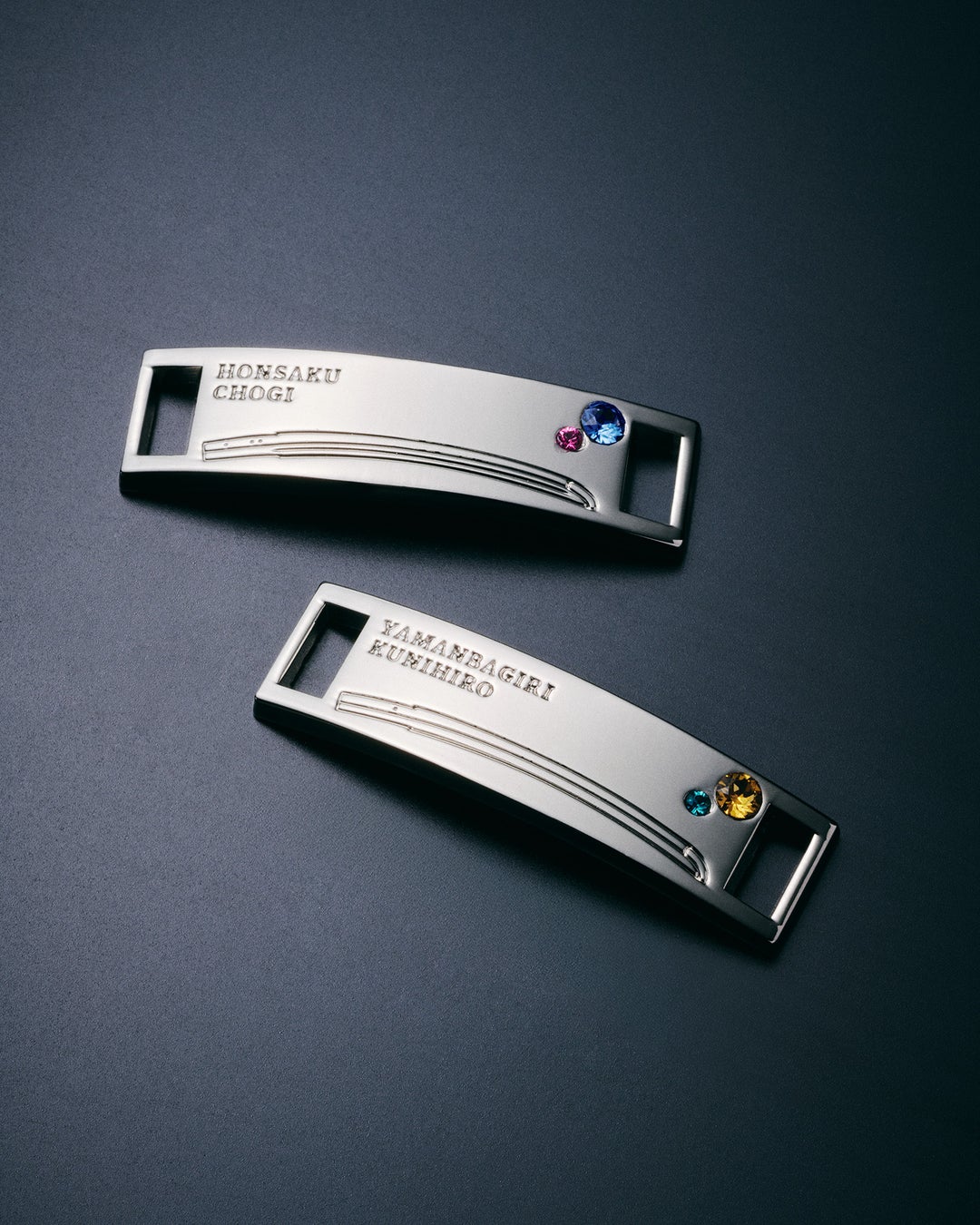 シューレースはベースのホワイトに加え、ブルーとオレンジの計3種が付属。アグレット(シューレース先端部分)にはそれぞれの刀剣名が刻まれています。さらには刀身を刻印したシューレースチャーム1組が付いてくるため、自分仕様のオリジナルにカスタマイズしてお楽しみいただけます。
