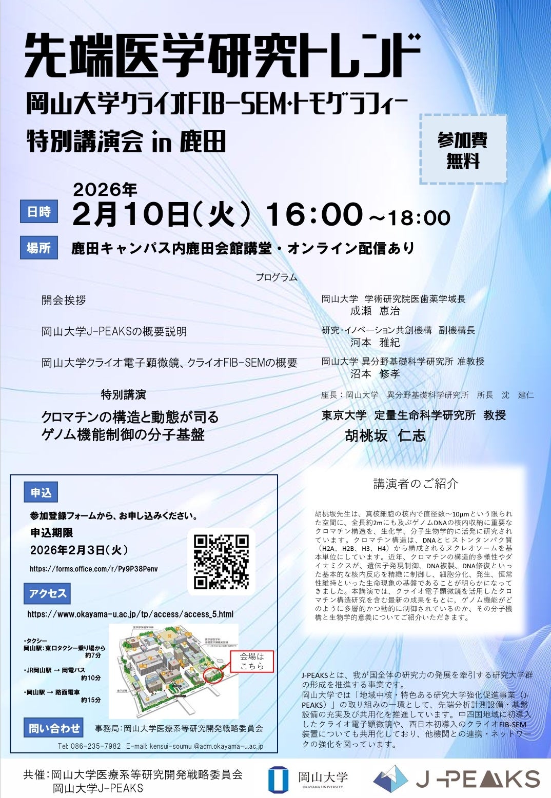 【岡山大学】岡山大学「先端医学研究トレンド~岡山大学クライオFIB-SEM・トモグラフィー特別講演会 in 鹿田~」〔2/10,火 ハイブリッド開催〕