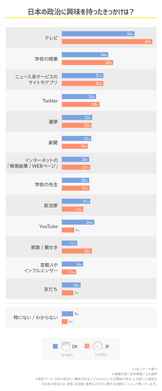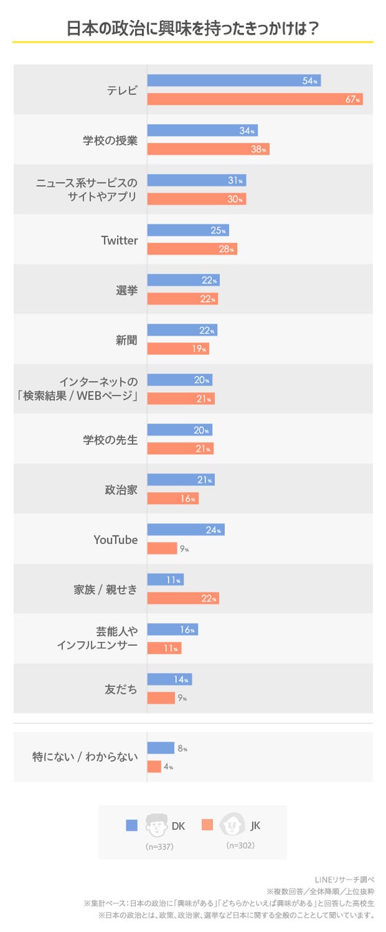 【LINEリサーチ】日本の政治に興味がある高校生は全体で6割以上、日本の政治に興味を持ったきっかけは「テレビ」が男女ともに1位