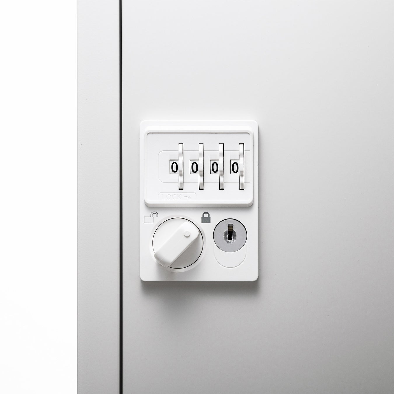 4桁の暗証番号で施解錠する錠前を標準装備しています。ダイヤル錠は固定式、ワンタイム式の両方に対応しており、利用者が決まっている場合は固定式、利用者が不特定多数で都度変わる場合ワンタイム式がおすすめです。