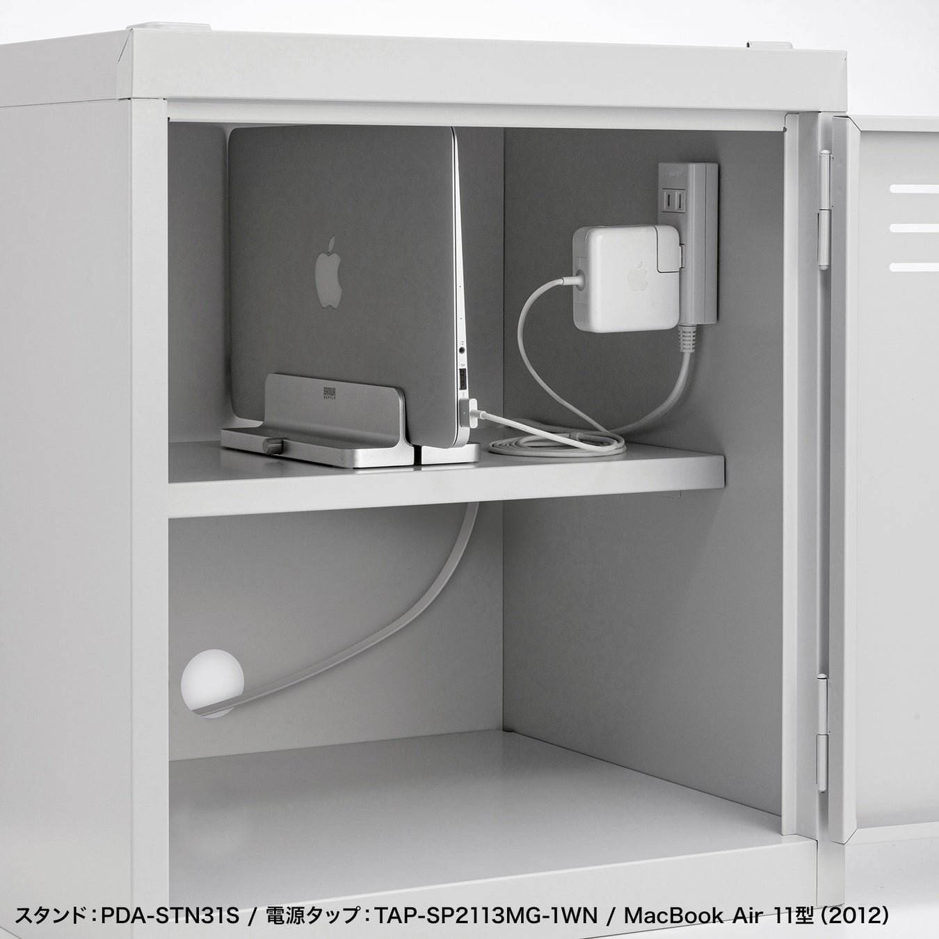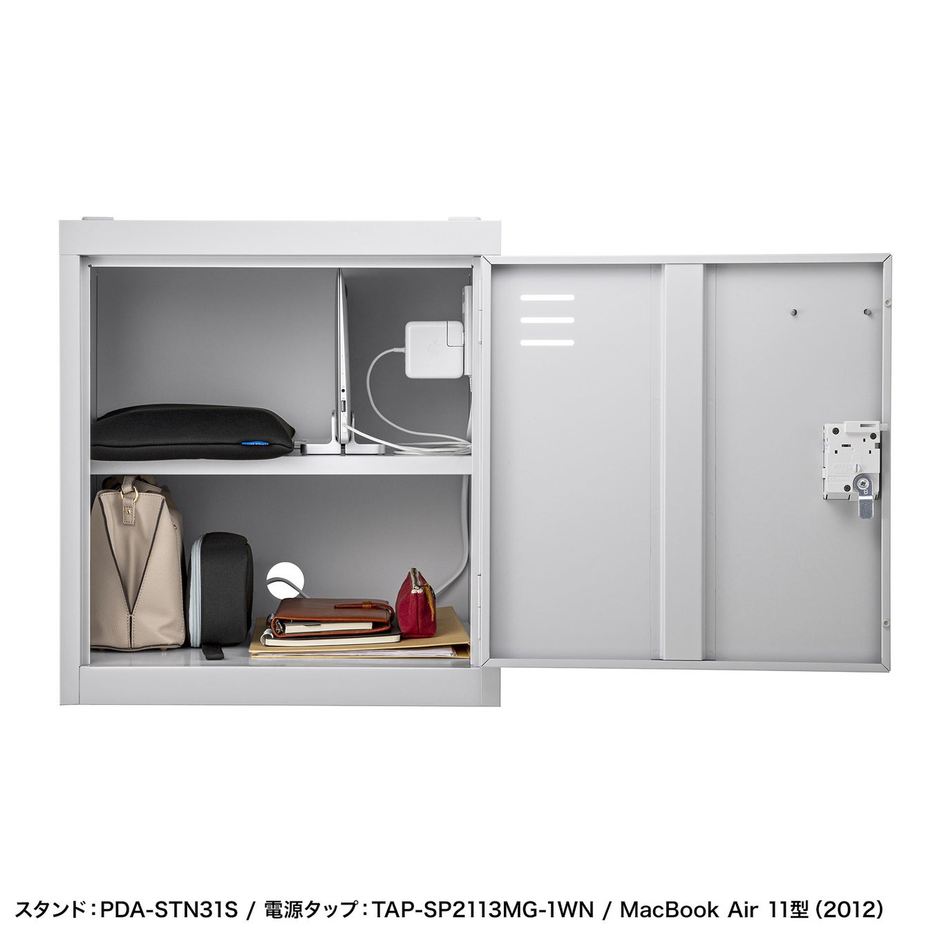 背面部にはケーブル口があり、内部にタップを設置するとパソコンやタブレットを充電させながら保管できます。
