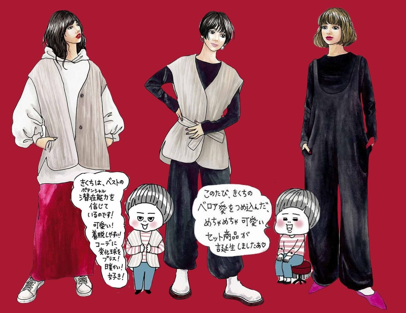 イラストレーターきくちあつこコラボ冬の新作「キルティングベスト」と「ベロアロンパースセット」がフェリシモ「IEDIT[イディット]」から登場