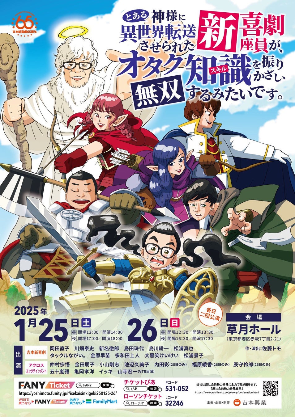 2025年1月25日(土)・26日(日)に草月ホールにて開催します、吉本新喜劇の座員・岡田直子が企画した、声優事務所「アクロスエンタテインメント」とのコラボ新喜劇「とある神様に異世界転送させられた新喜劇座員が、オタク知識(スキル)を振りかざし、無双するみたいです。」の公演あらすじとグッズ情報が解禁になりました。
