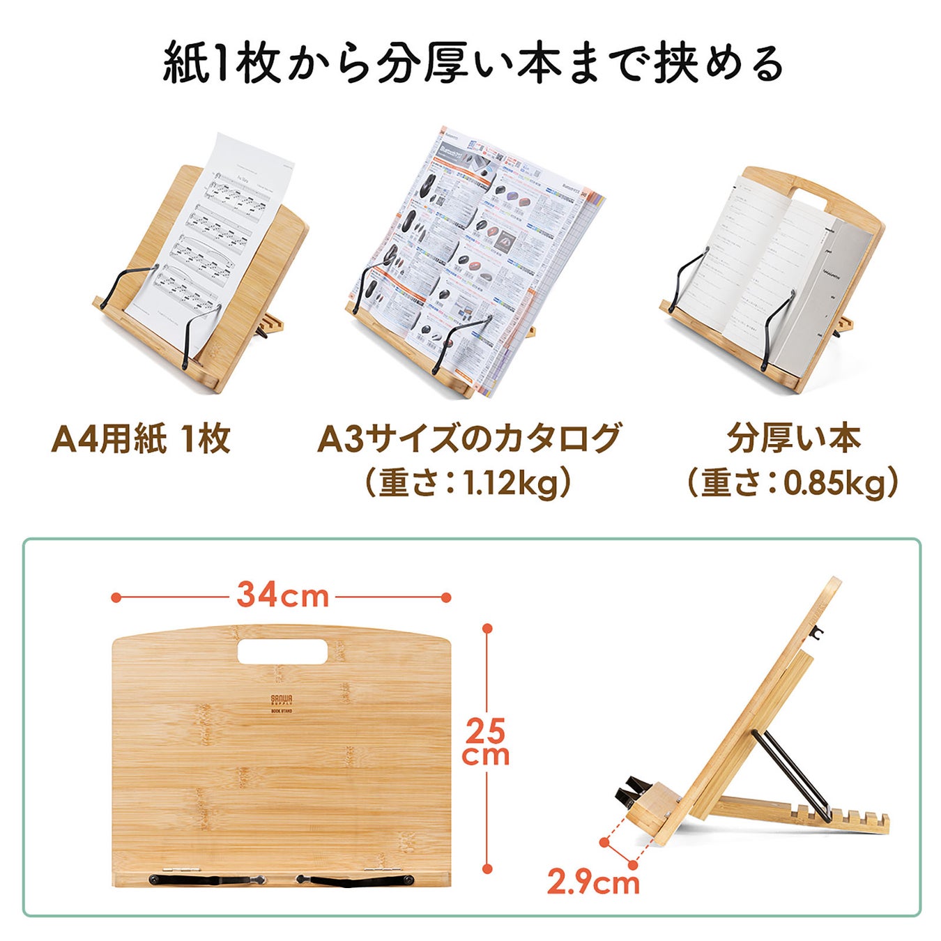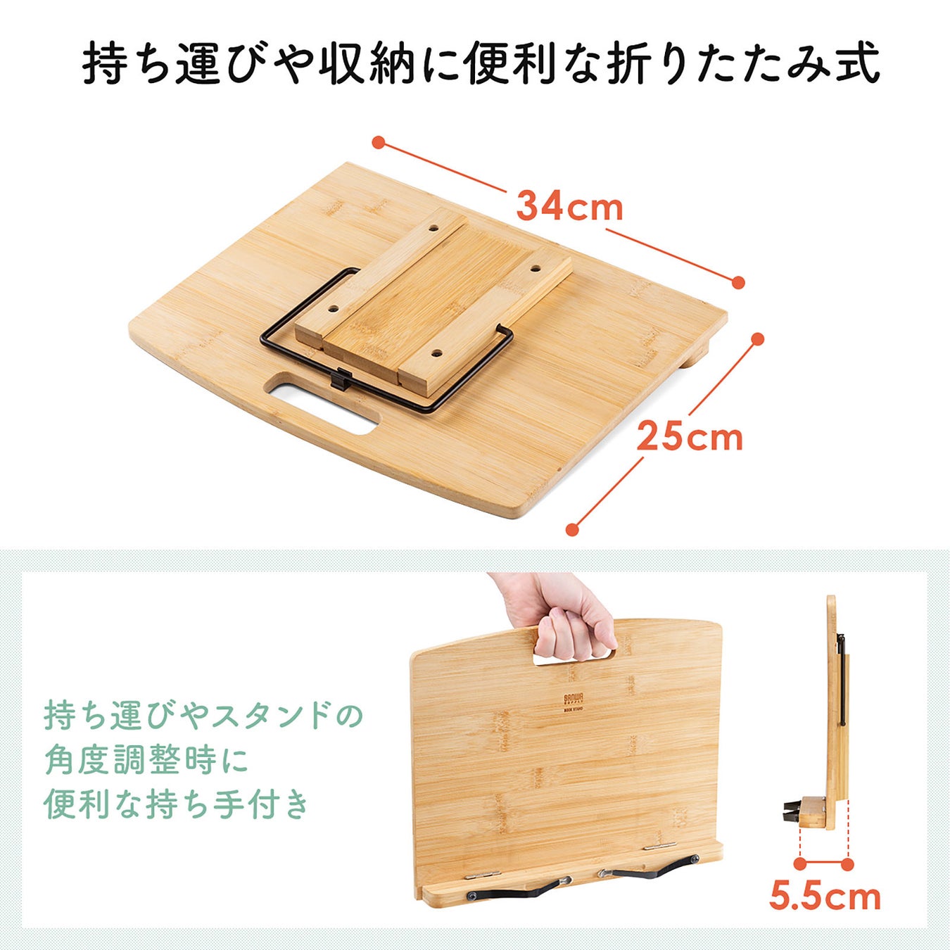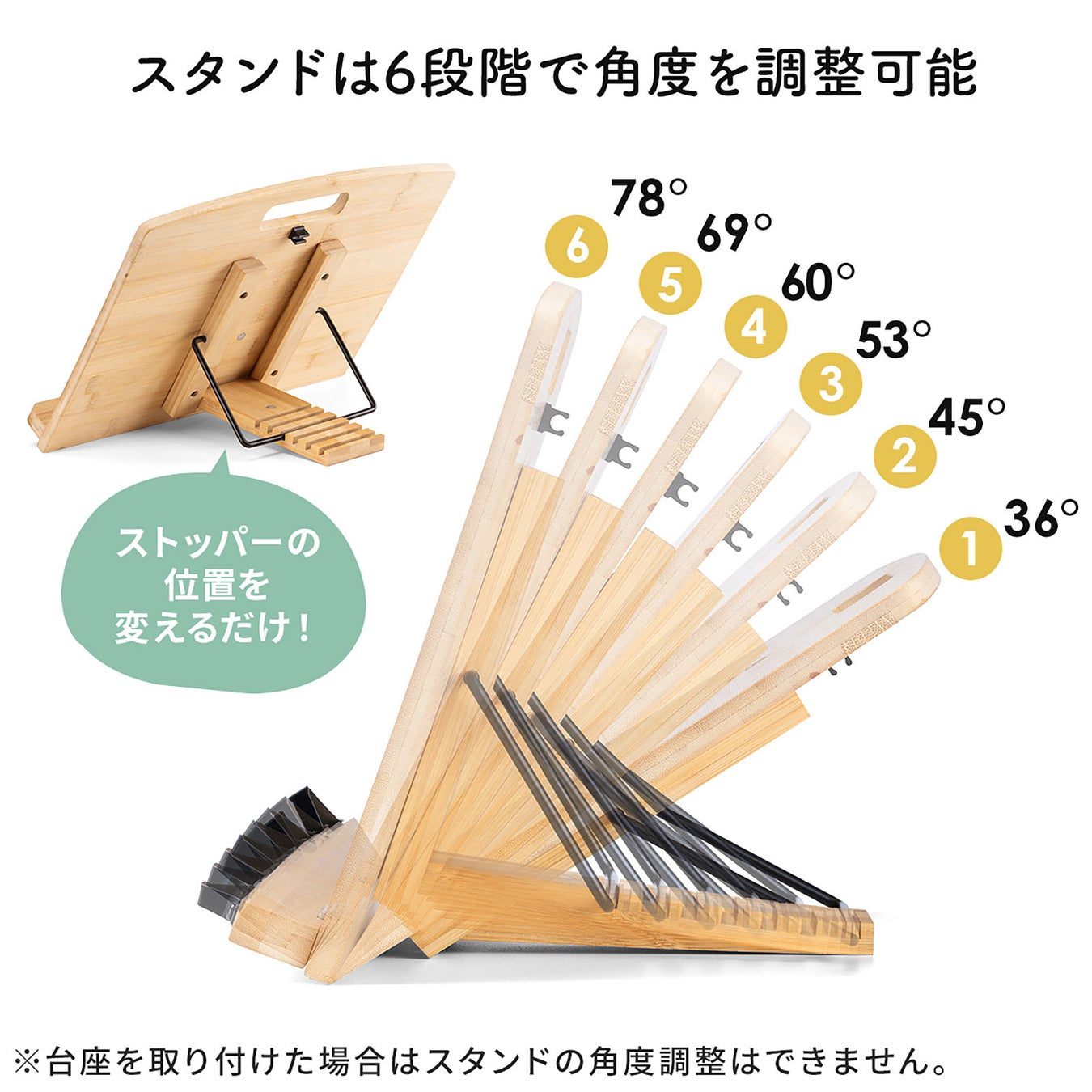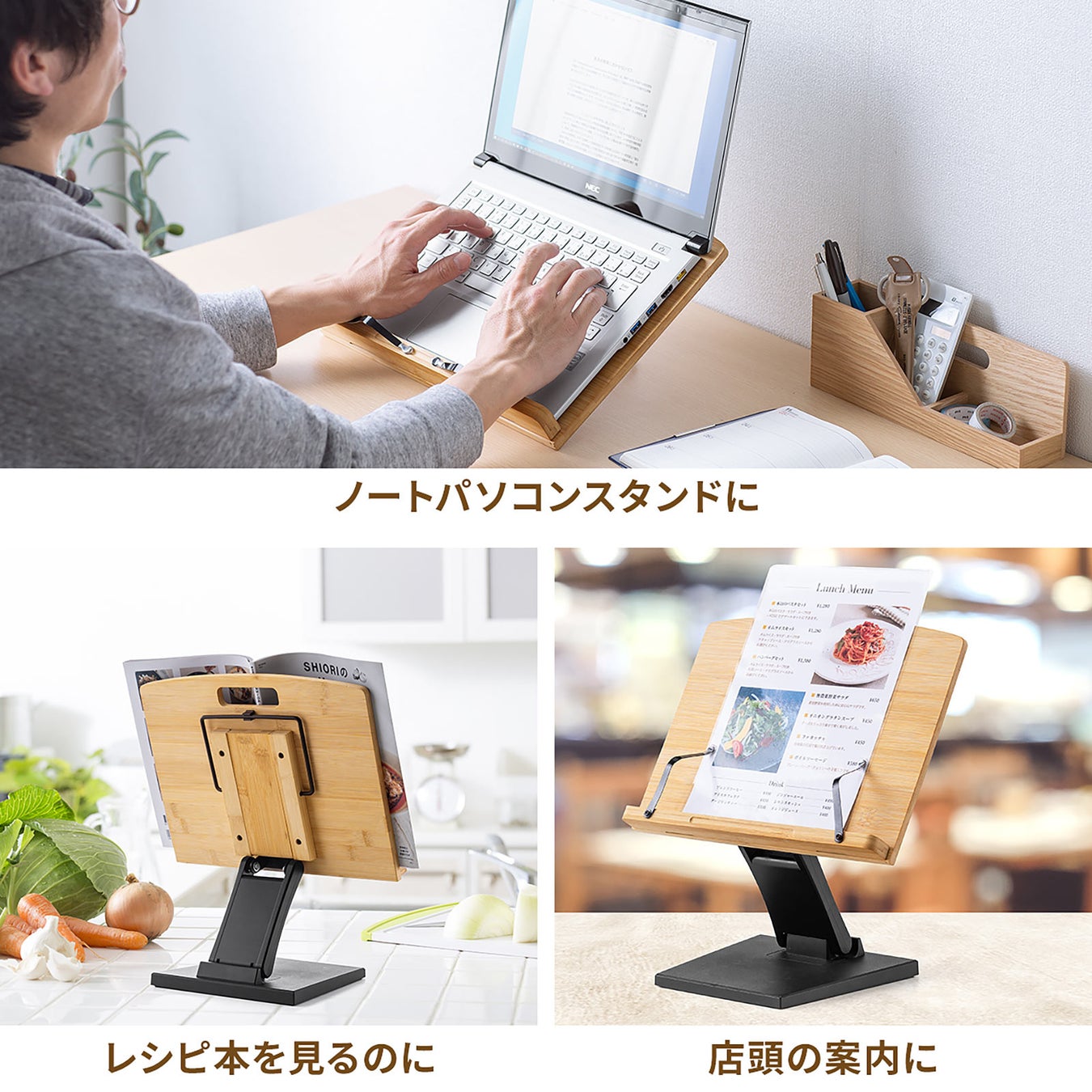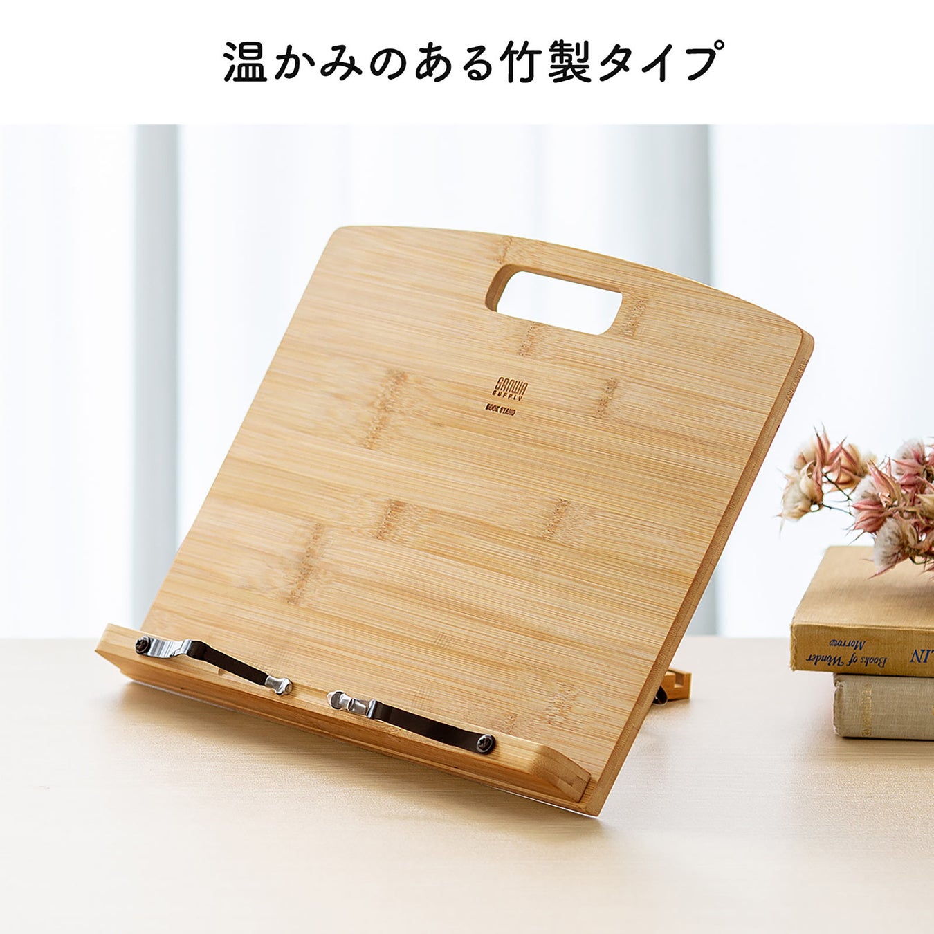 本製品は、見やすい角度、高さに調整できる台座付きブックスタンドです。材質には竹を採用し、温かみのあるタイプです。
