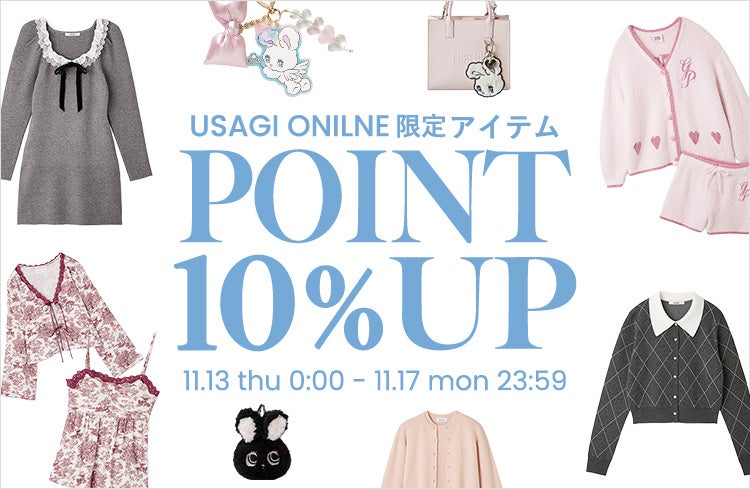 USAGI ONLINEサイト・USAGI ONLINE公式アプリ内にて、USAGI ONLINE限定アイテムをご購入いただくとポイント還元率が+10%となります。