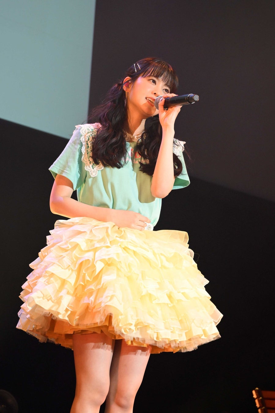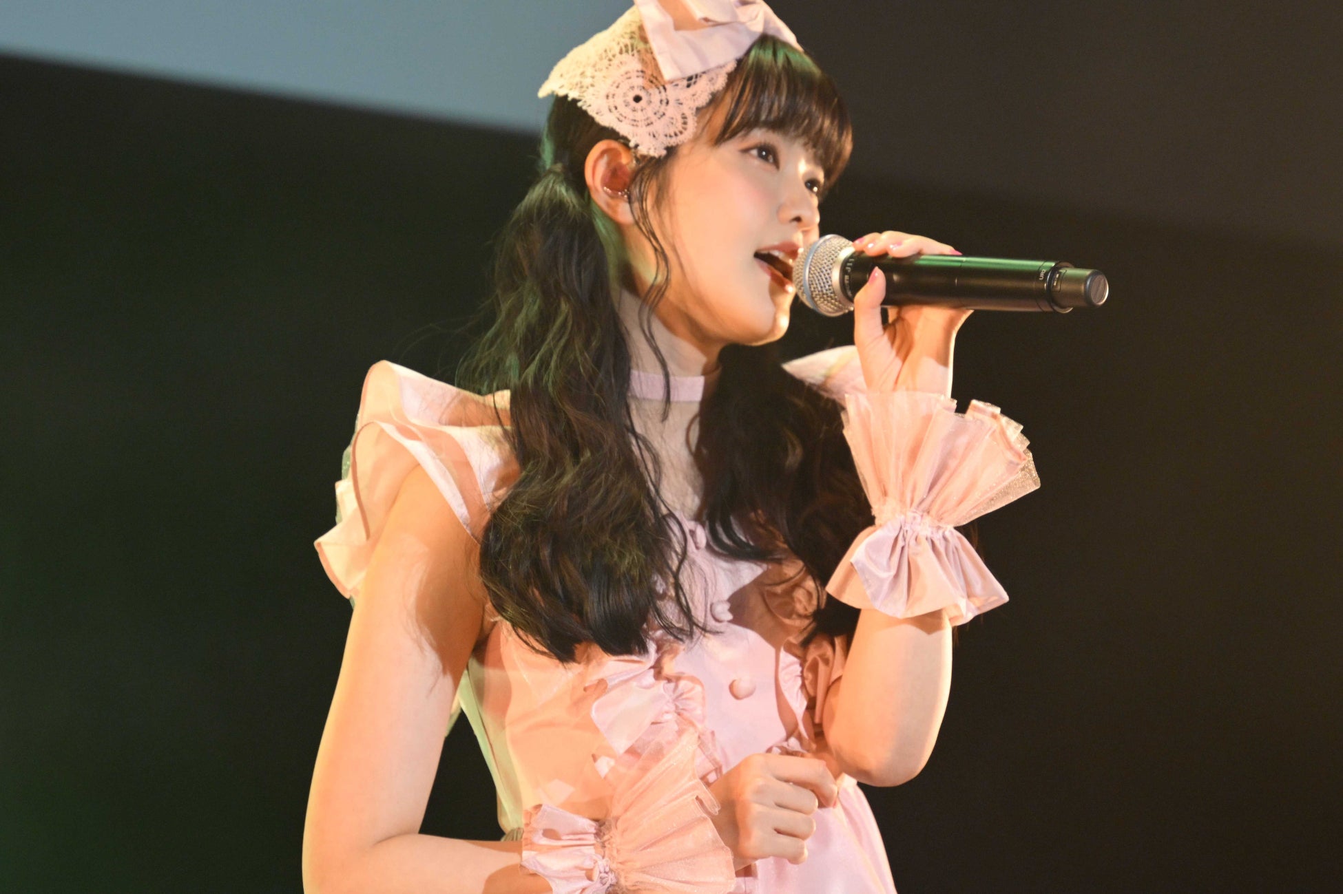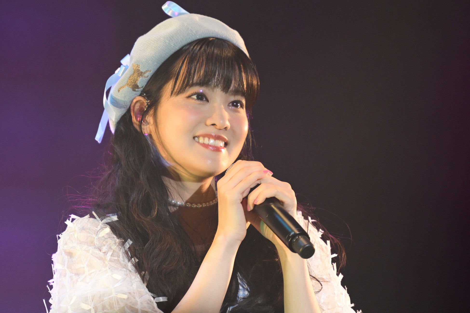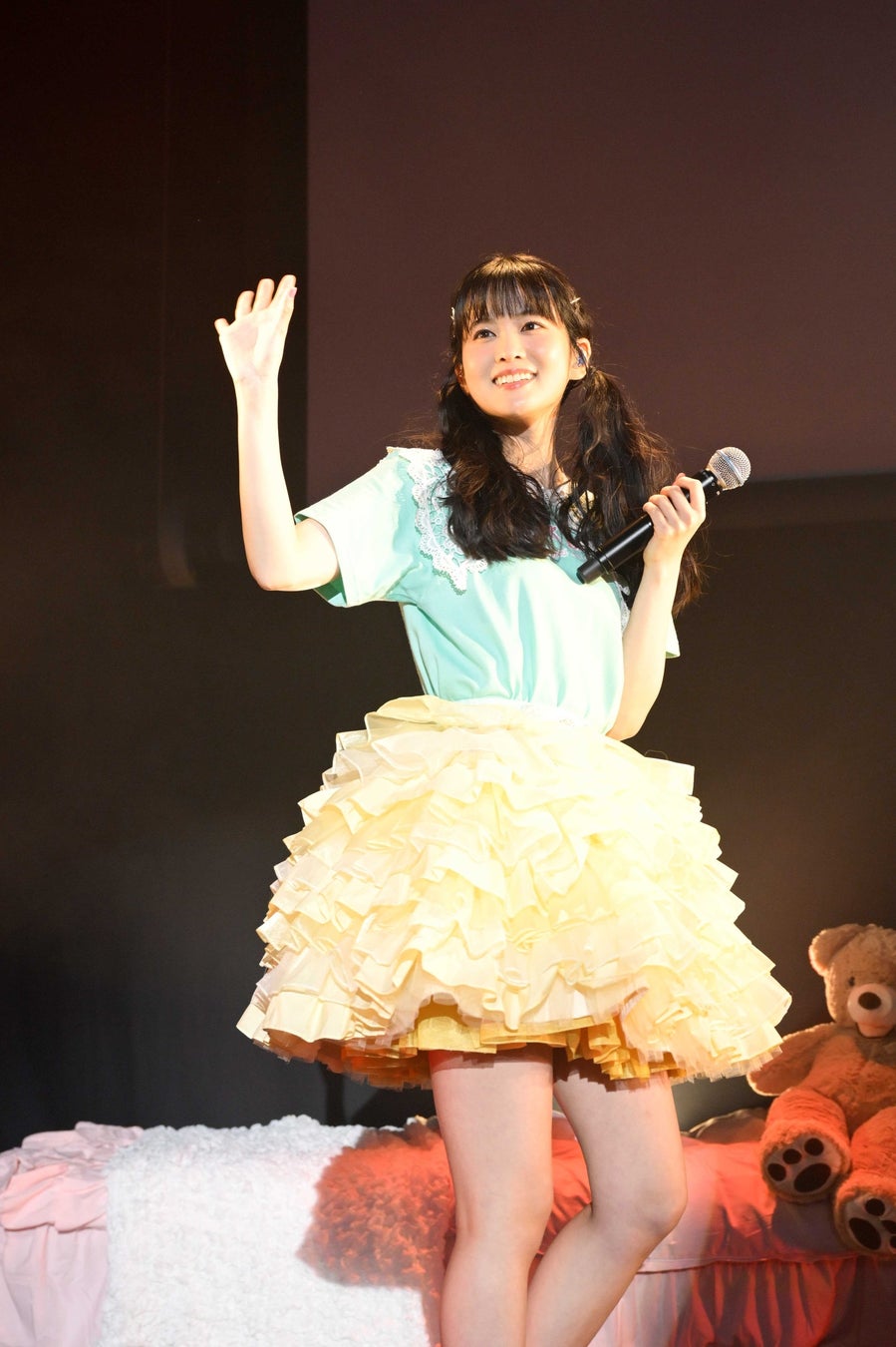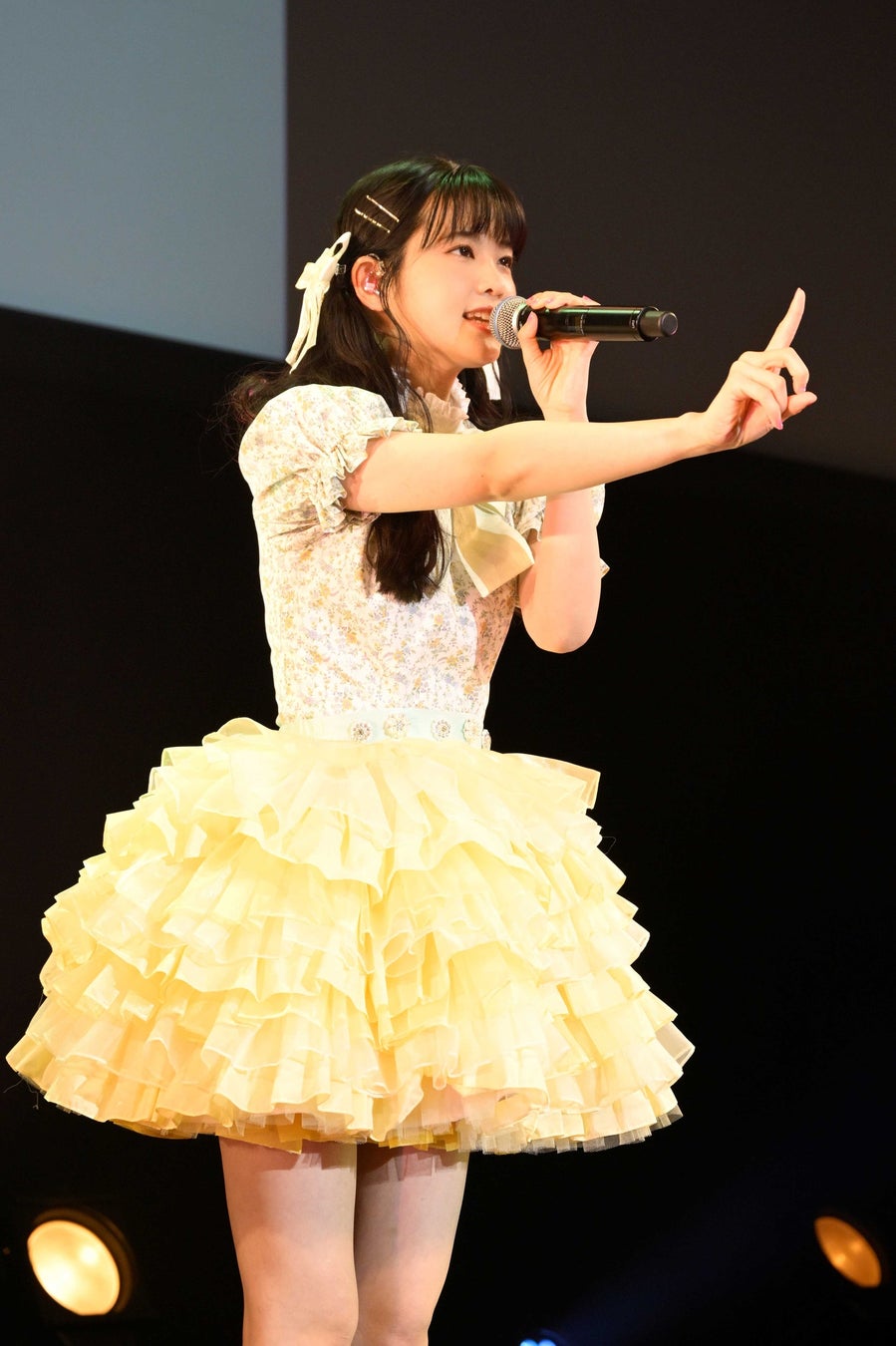 その熱気のまま、デビュー曲「本日は晴天なり」へ。白と水色の衣装にチェンジしたあぐぽんが、恋する乙女の気持ちを、切なさも込めて歌っていく。続けて「指先ハート」は、指先でハートを作るかわいい振り付けと共に披露。2曲続けて、君への“大好き”の気持ちを歌って盛り上がりまくると、再びナレーションへ。