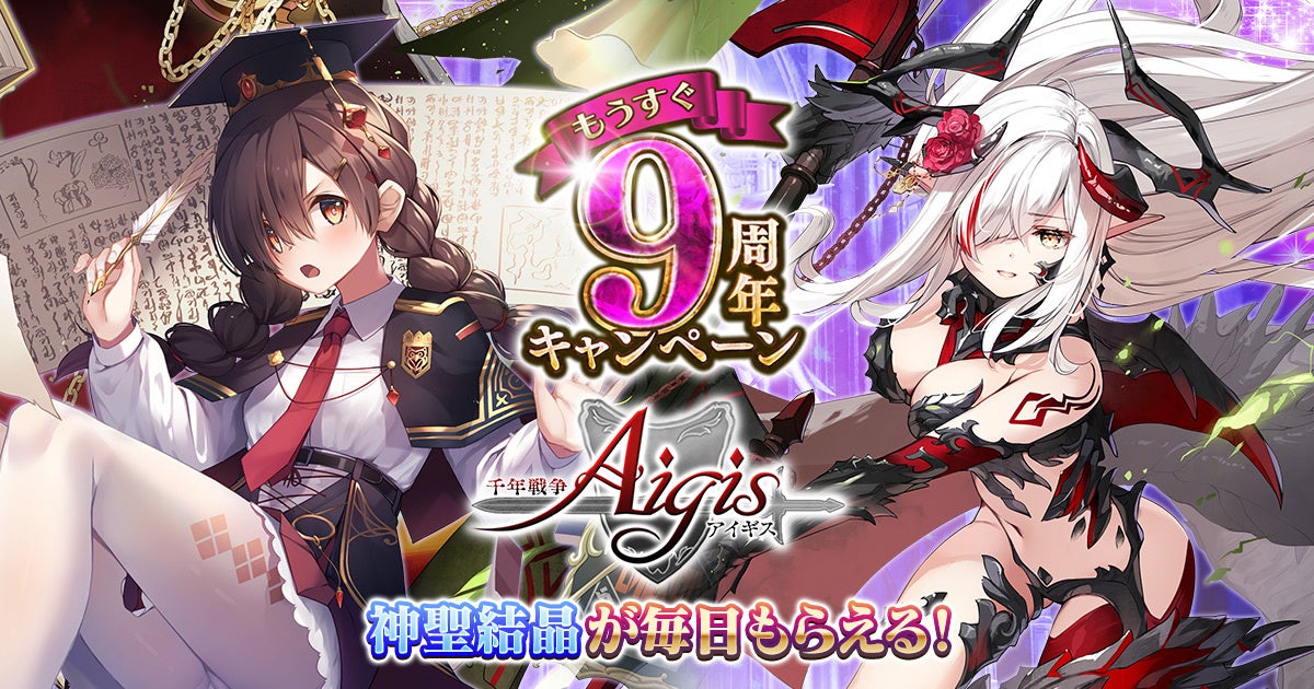合同会社EXNOA(本社:東京都港区、CEO:村中 悠介、URL:https://games.dmm.com/)が運営するDMM GAMESにおいて、11月17日(木)メンテナンス後より、本格タワーディフェンスRPG『千年戦争アイギス (以下「アイギス」)』の「もうすぐ9周年キャンペーン」を開催したことをお知らせいたします。