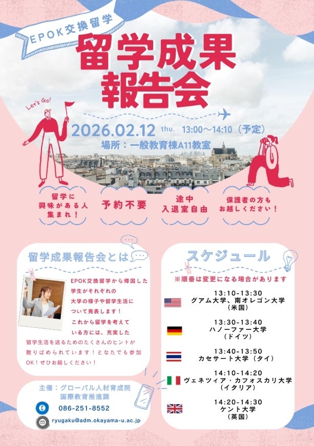 国立大学法人岡山大学(本部:岡山市北区、学長:那須保友)では、岡山大学短期留学プログラムEPOK(Exchange Program Okayama)から帰国した学生がそれぞれの大学の様子や留学生活について発表する「留学成果報告会」を、2026年2月12日(木)13:00~14:30に本学津島キャンパスで開催します。