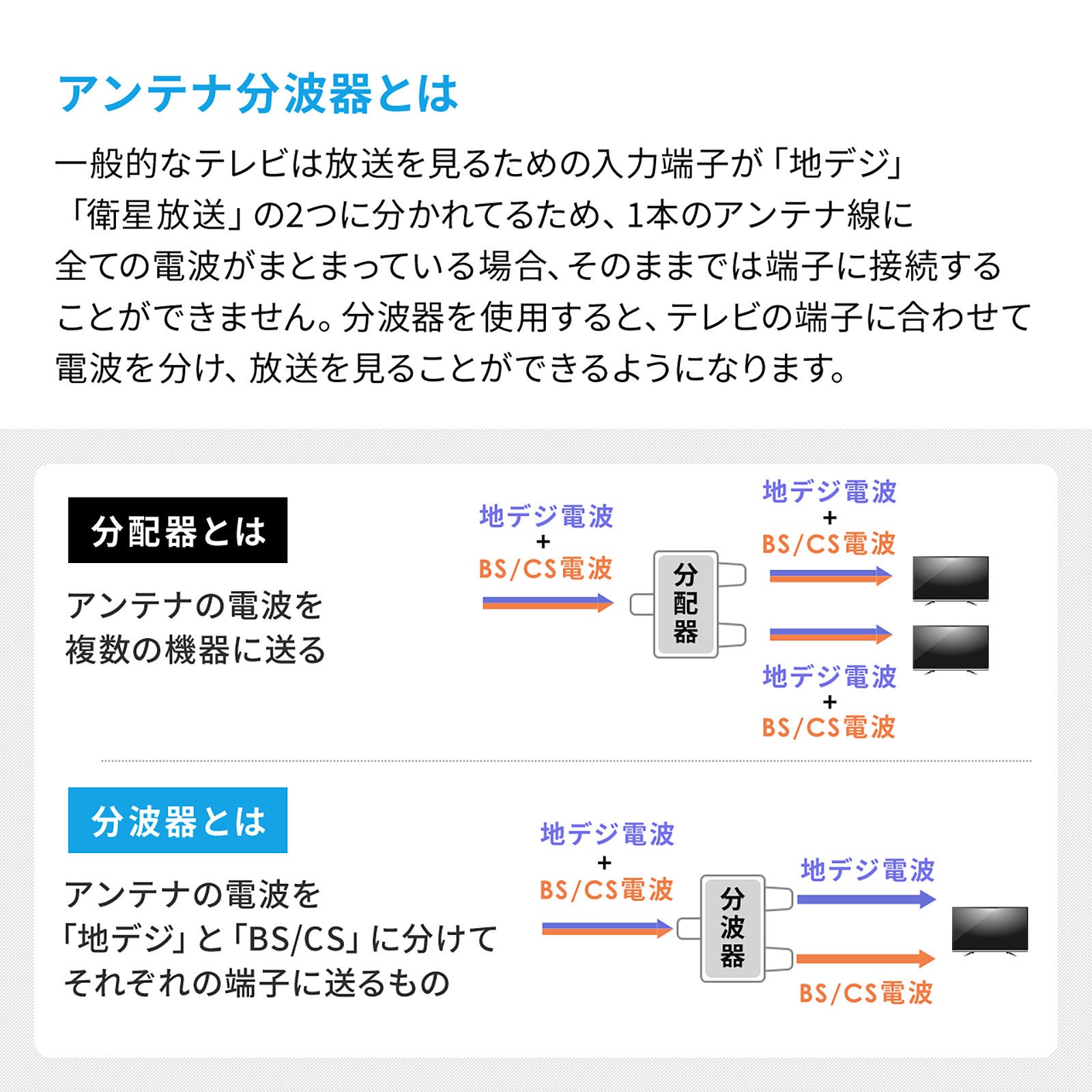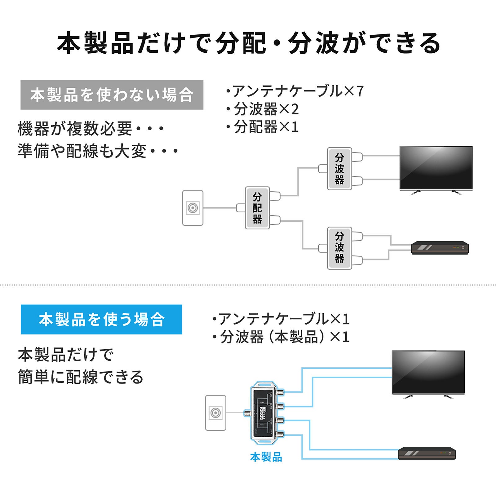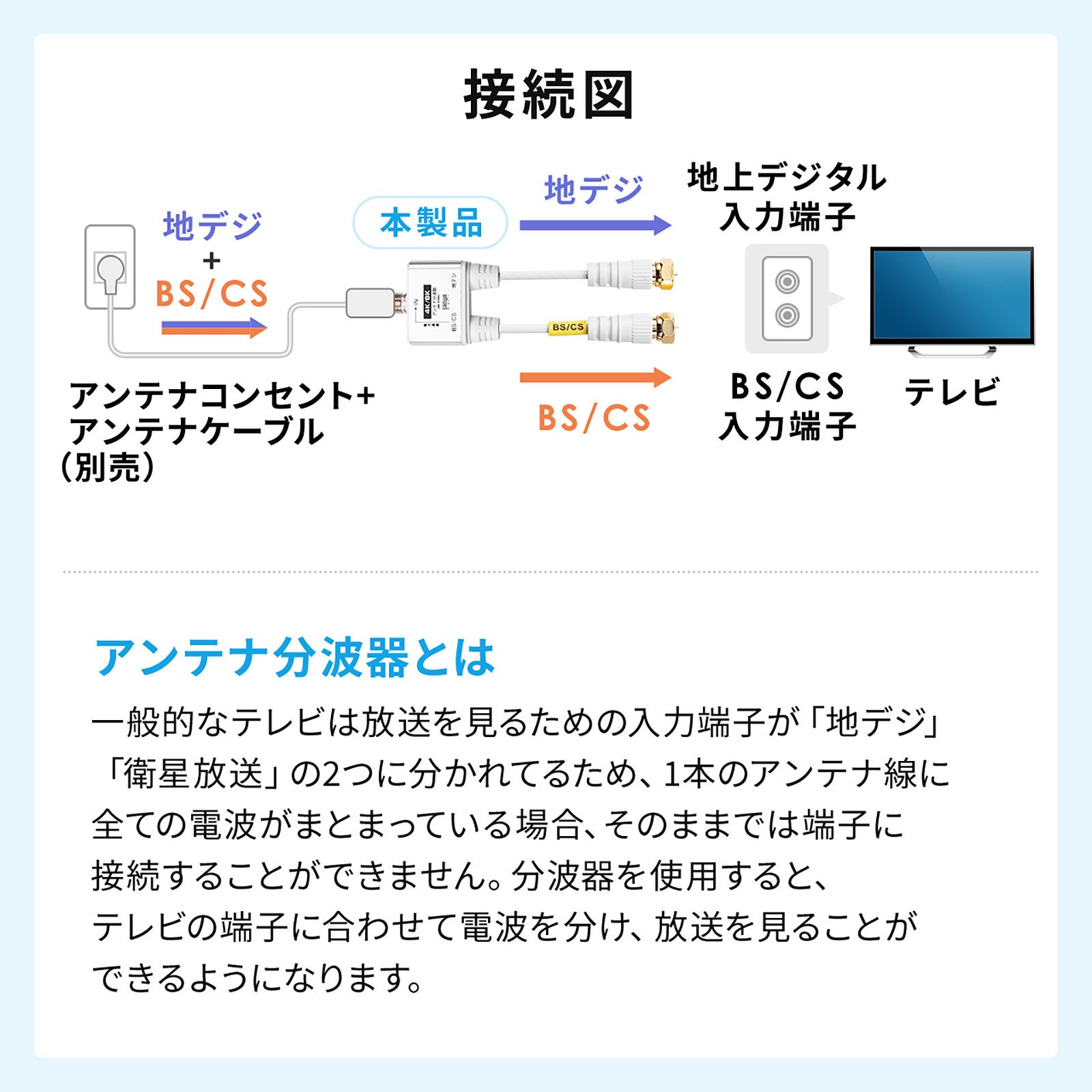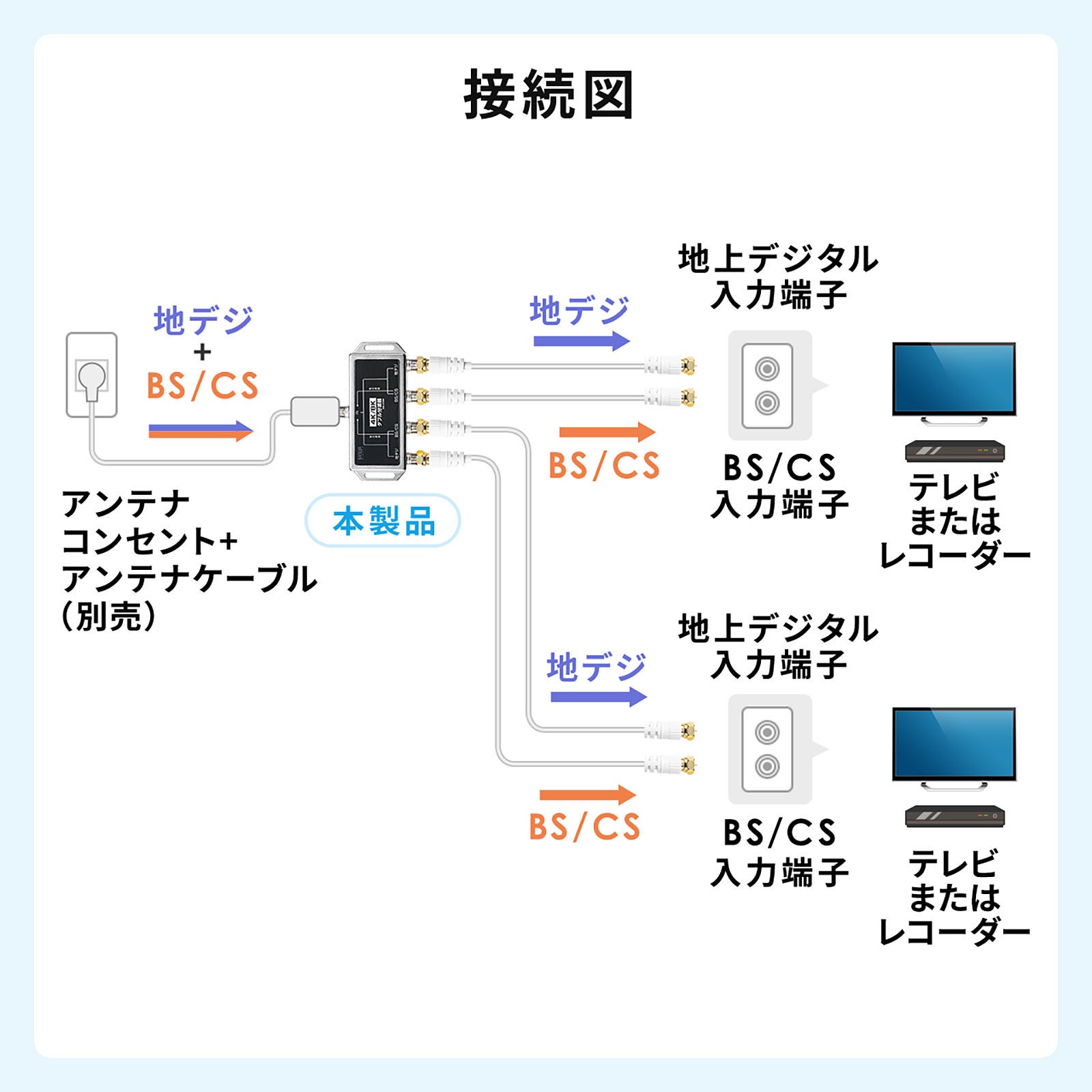 本製品は、1本のアンテナケーブルで地デジとBS/CSに分けて接続ができます。