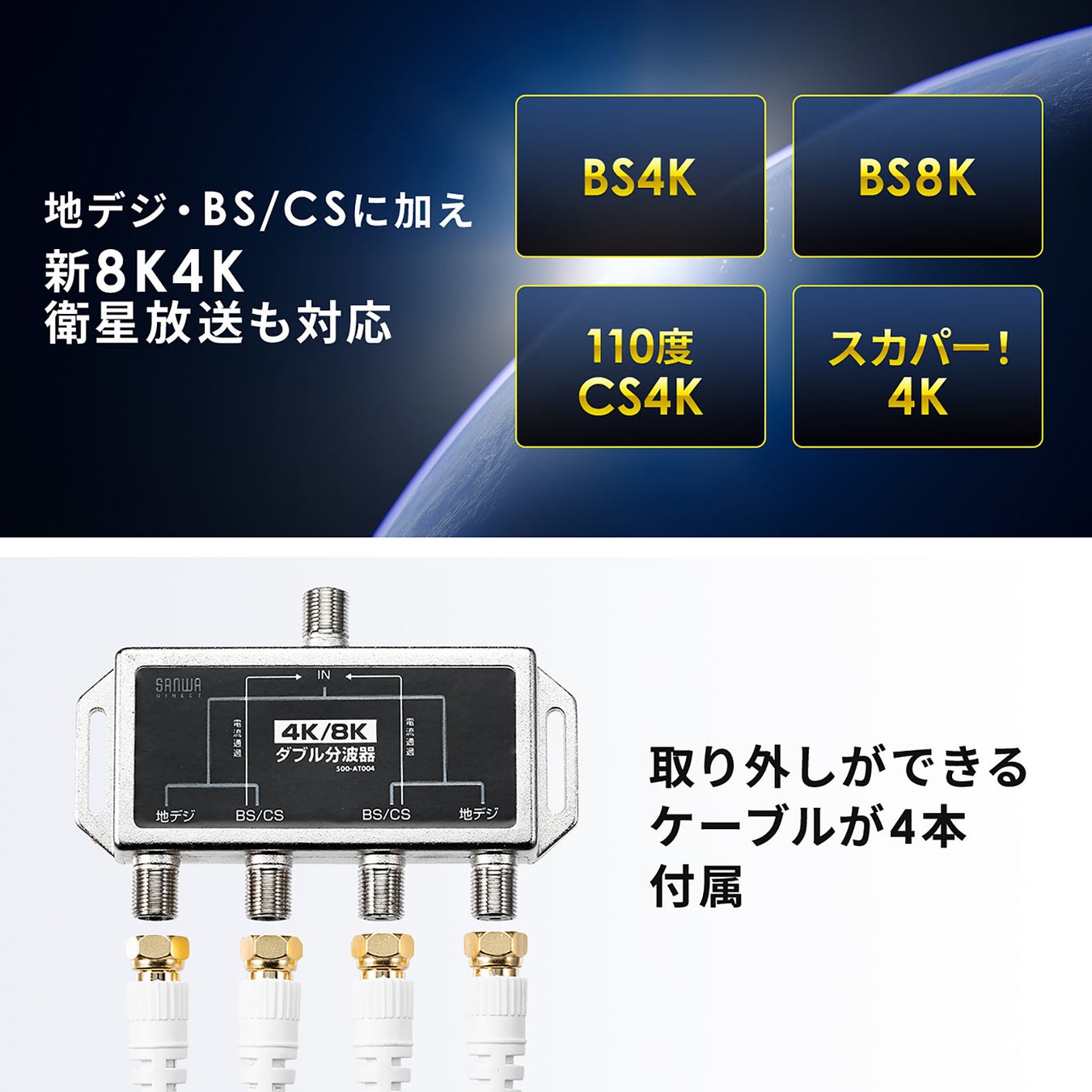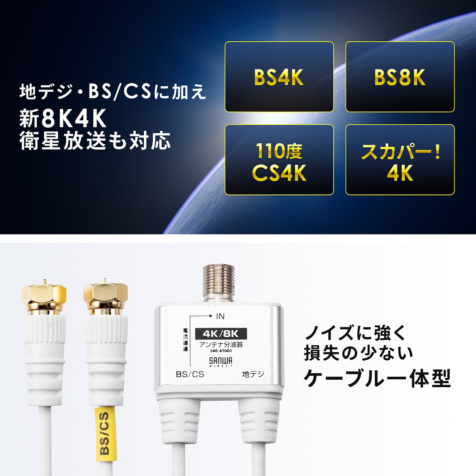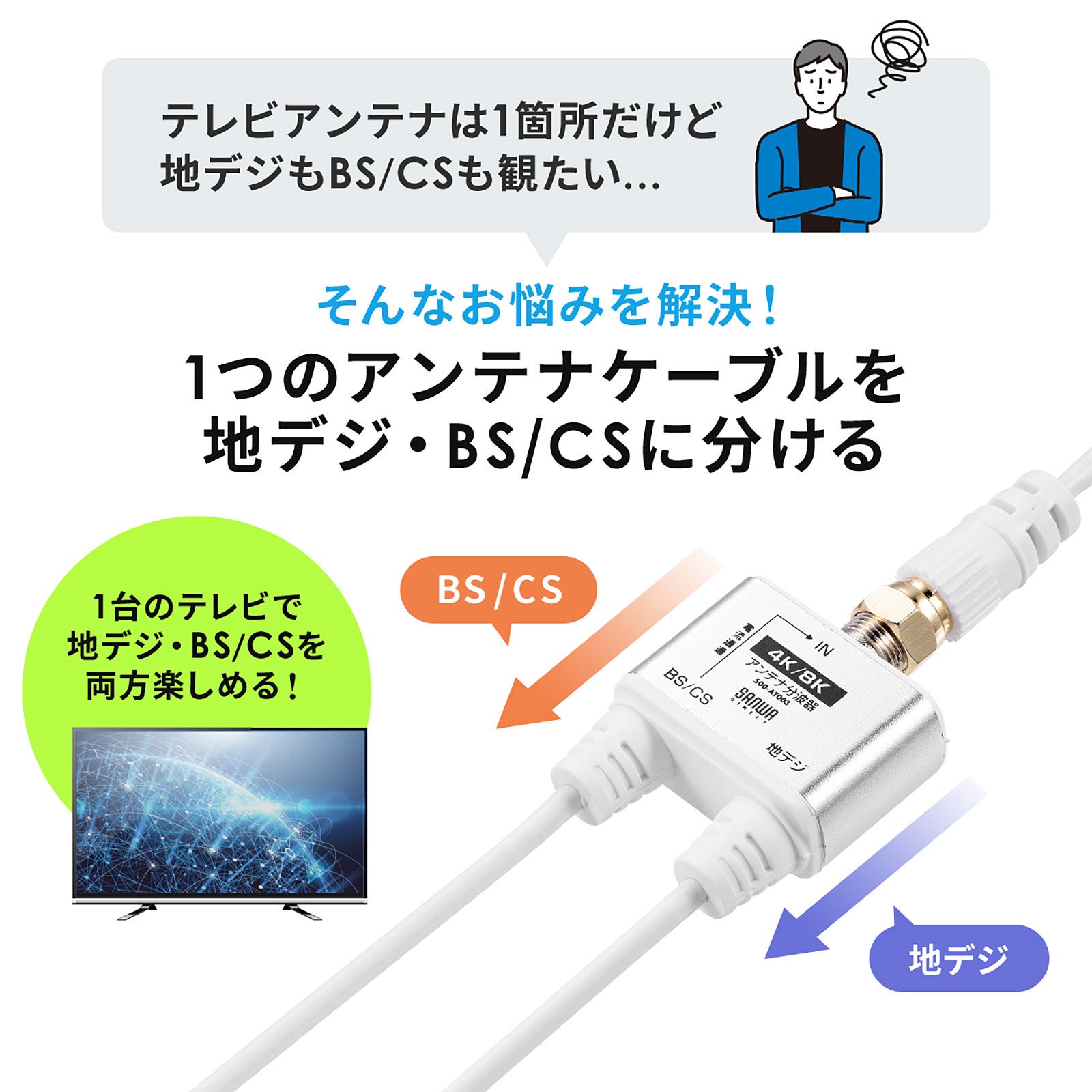 サンワサプライ株式会社(本社:岡山市北区田町1-10-1、 代表取締役社長 山田 和範)が運営している直販サイト『サンワダイレクト』では、新4K8K衛星放送に対応した1本のアンテナケーブルを地デジとBS/CSに分けて接続可能で、スリムでノイズに強く損失の少ないケーブル一体型のアンテナ分波器「500-AT003(ケーブル長30cm・1分配)」、「500-AT004(ケーブル長50cm・2分配)」を発売しました。