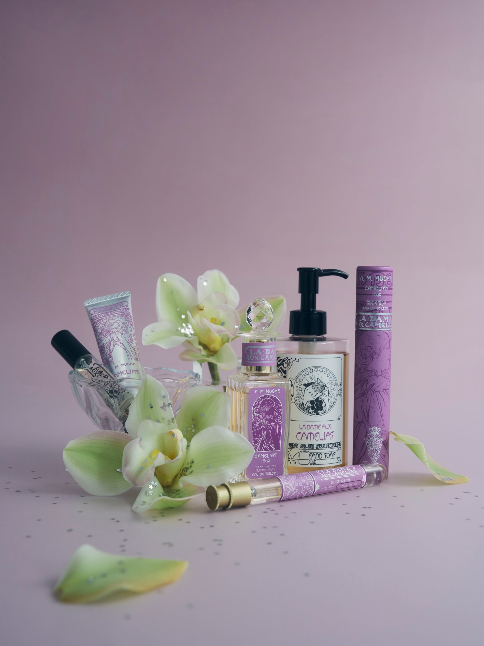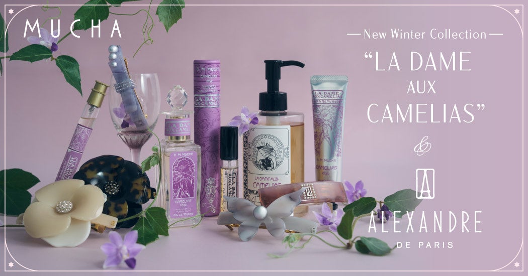 【MUCHA(ミュシャ)】作品『椿姫』がモチーフの人気フレグランス「カメリア」がボトルデザインをリニューアルして登場!〈アレクサンドル ドゥ パリ〉より椿の花をテーマにしたスペシャルアイテムも同時発売