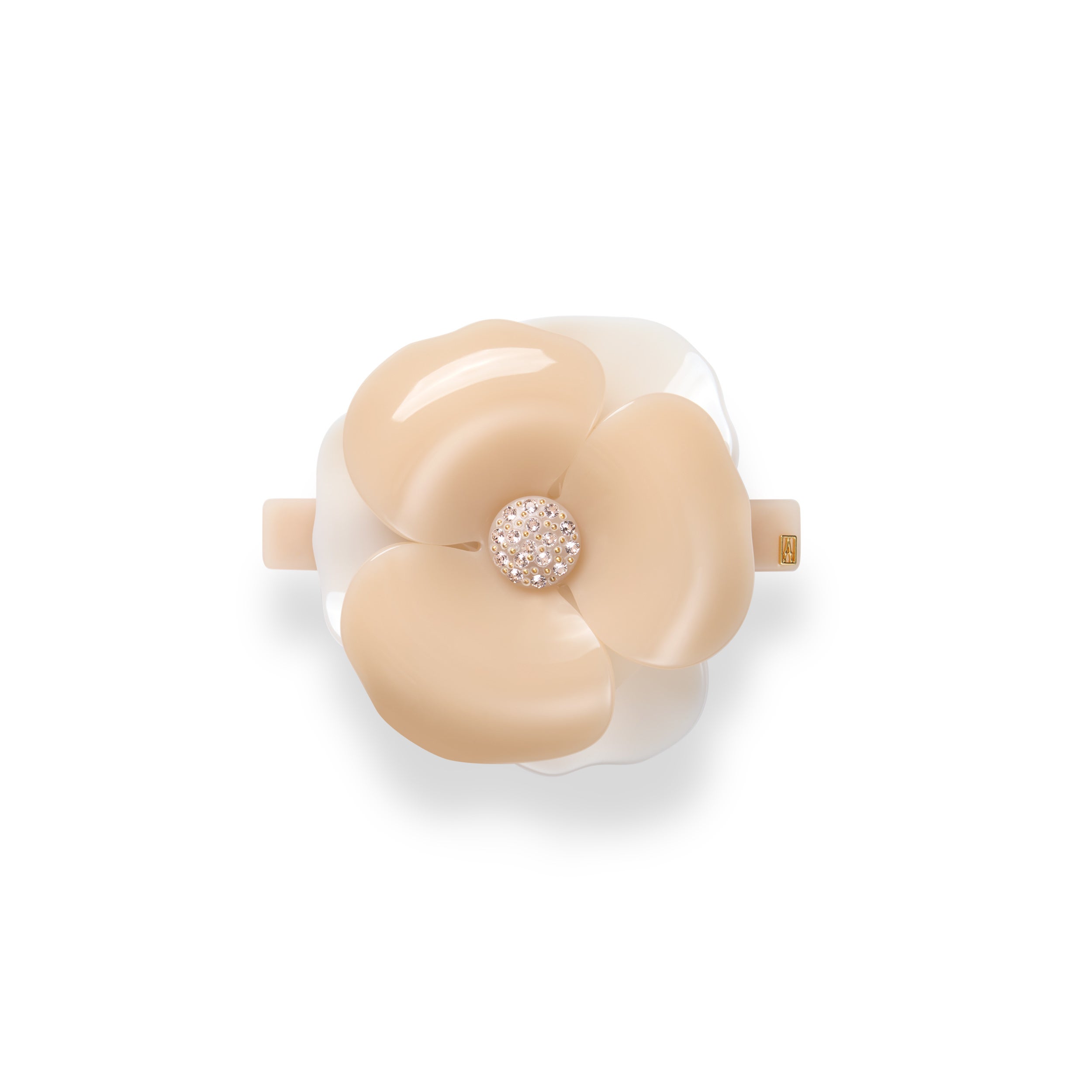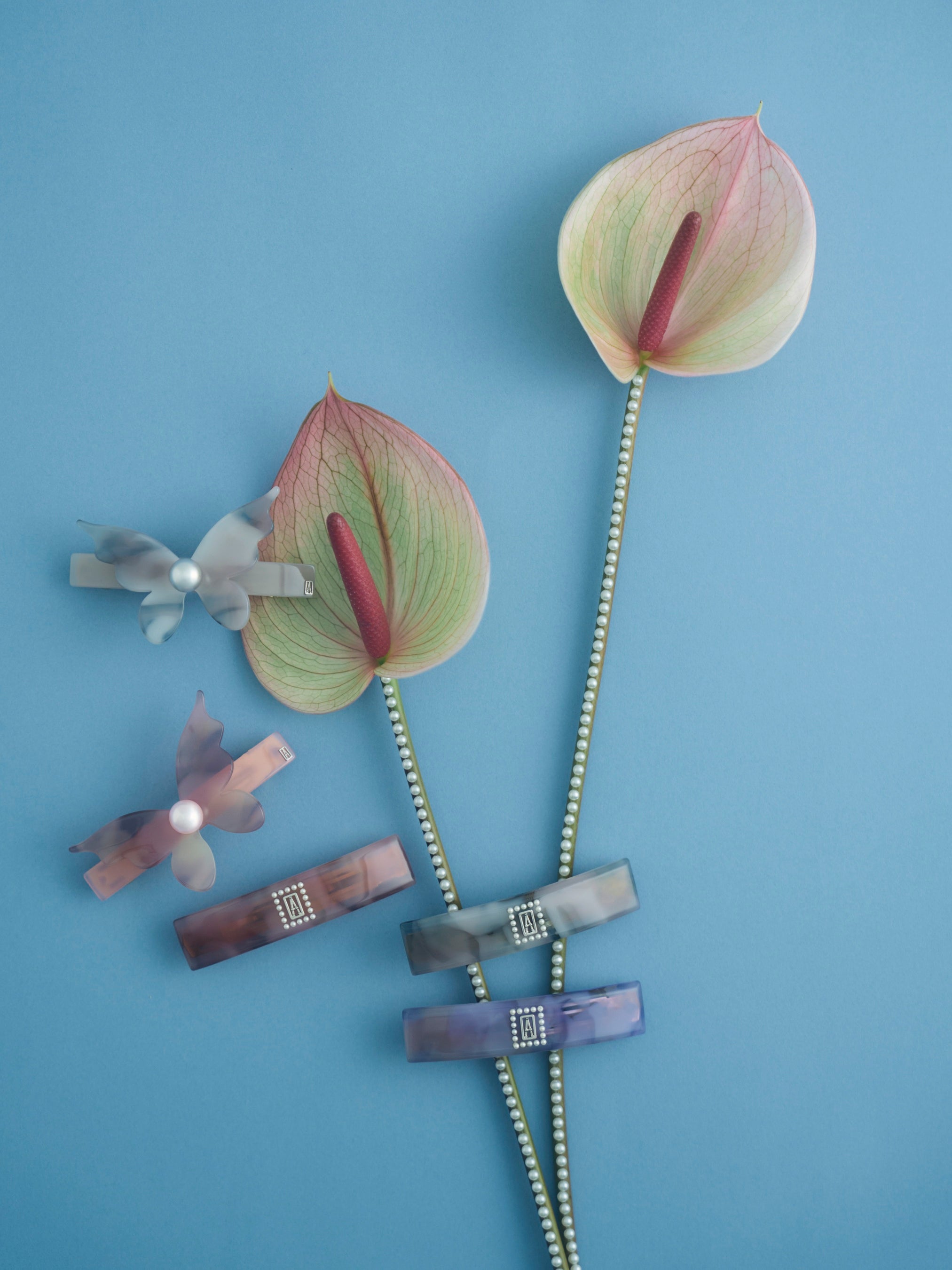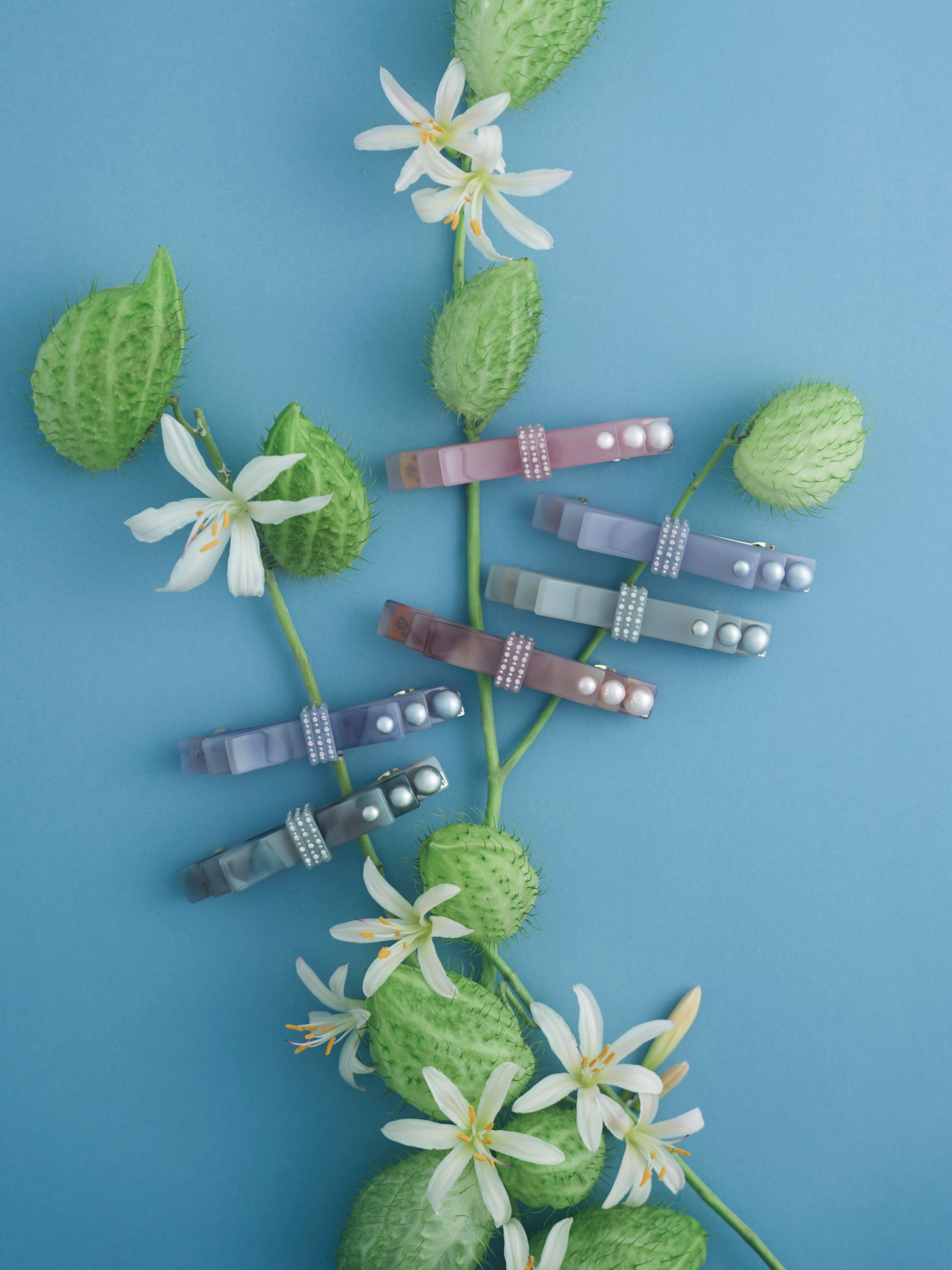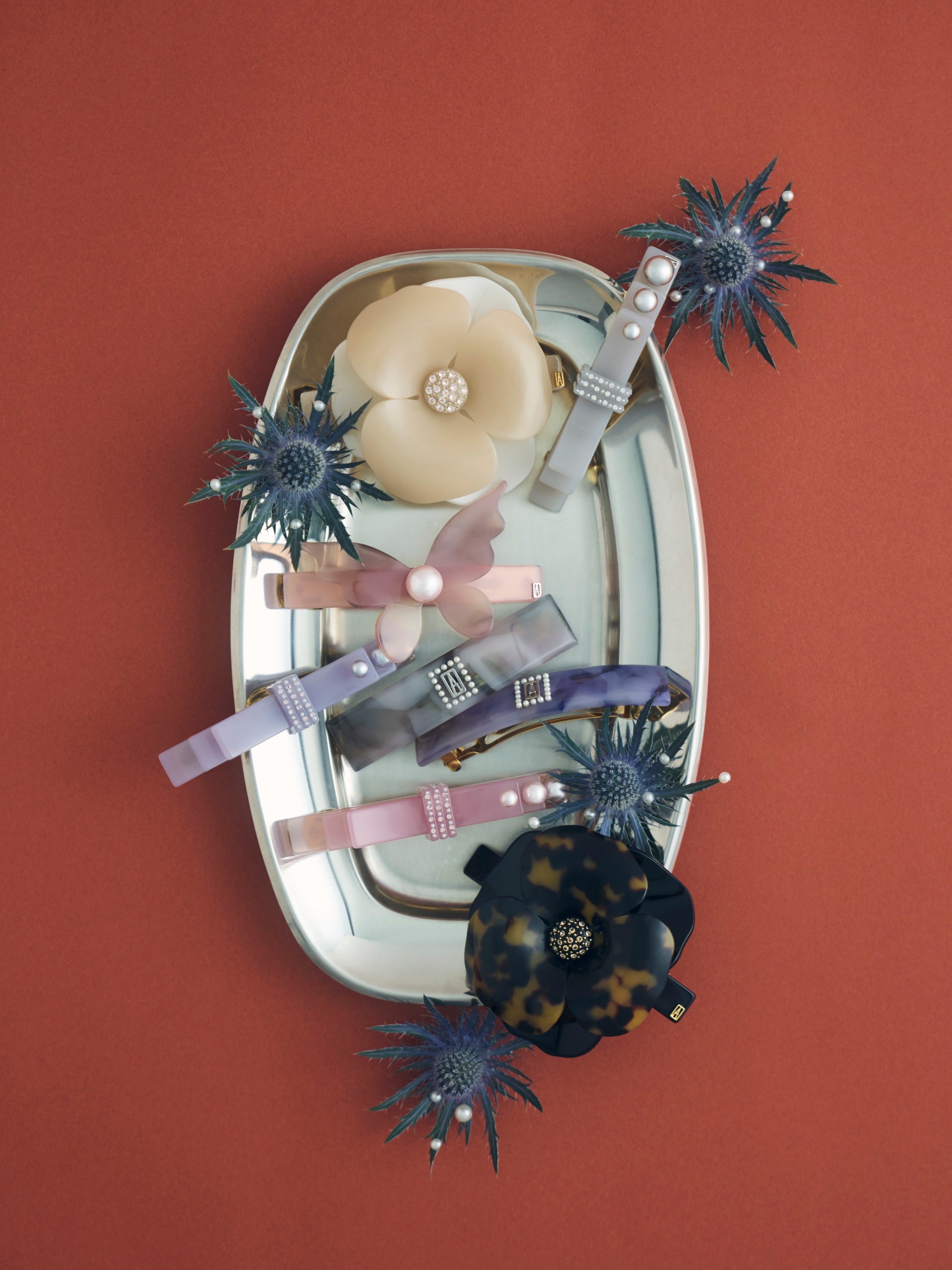 アセテートを重ねたリボンとアクセントのパールが立体的にセットされ可愛らしさの中に大人の気品を感じさせます。センターにはスワロフスキー®・クリスタルが煌めき、ヘアアレンジに華やかさをプラスしてくれます。バラ、ライラック、そして繊細なグレートーンの柔らかく女性的な色調のパレットで作られたヘアアクセサリーは、自然と都市生活のつかの間の瞬間を捉えたモネの卓越した技巧を繊細に表現しています。