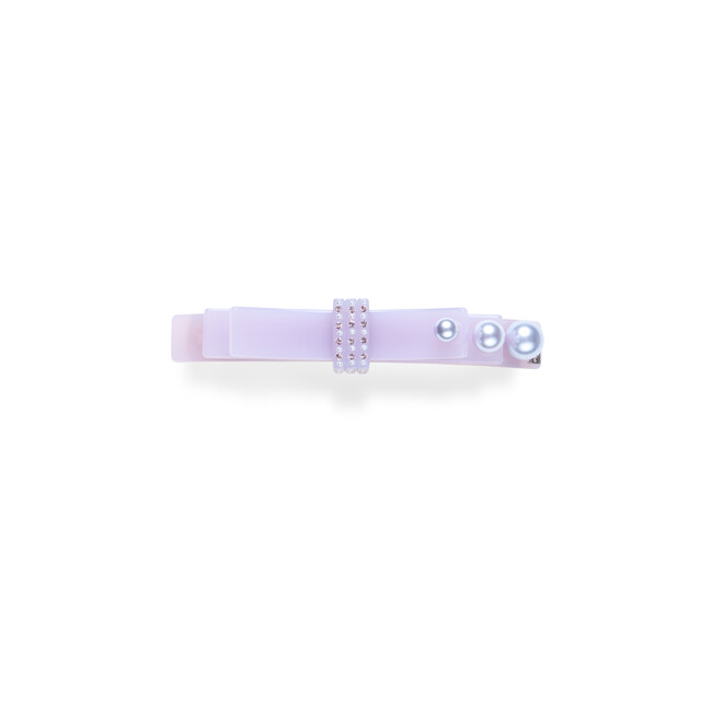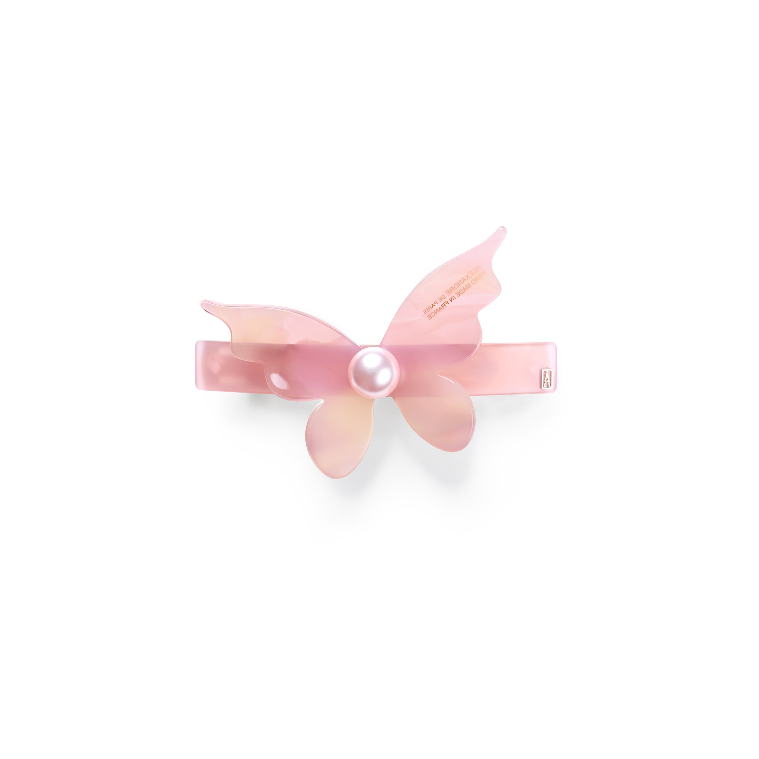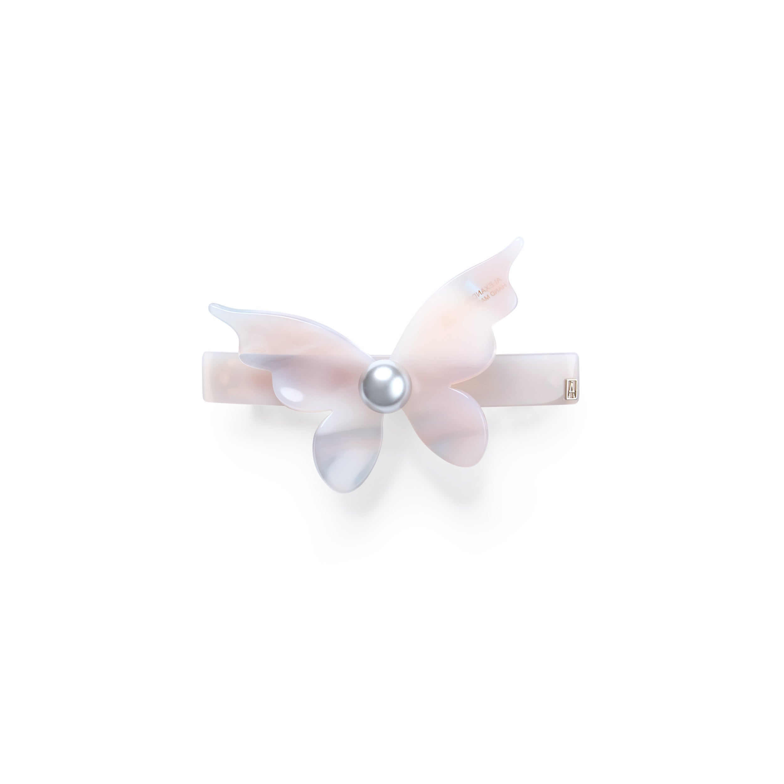 やわらかな色調のパピヨンが愛らしいバレッタ。ふんわりとしたマーブルパターンのクリアアセテートで作られたパピヨンは、職人による曲げの技術を堪能できるハンドメイドです。センターには、アクセントに同系色の>スワロフスキー®・クリスタル パールをセット。
