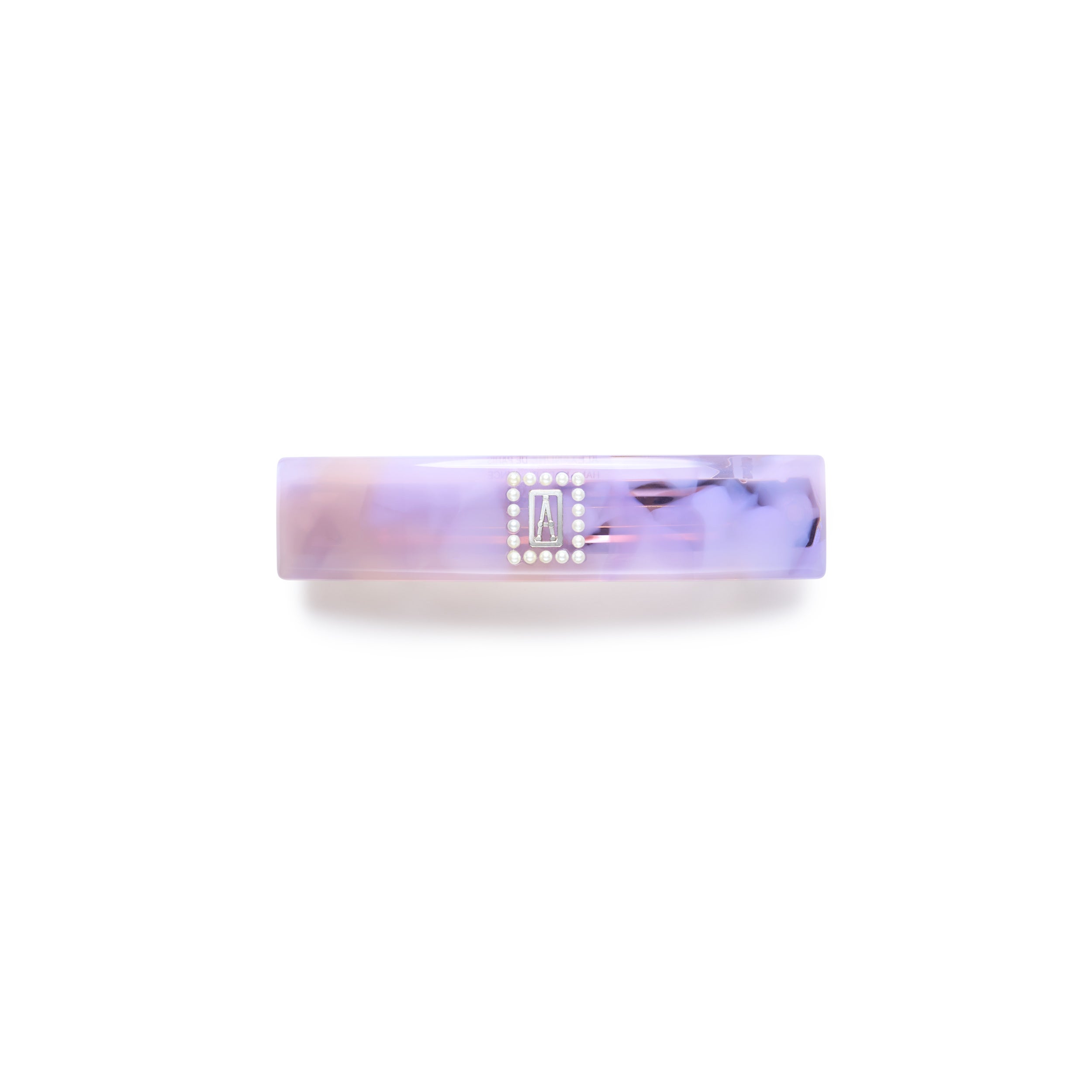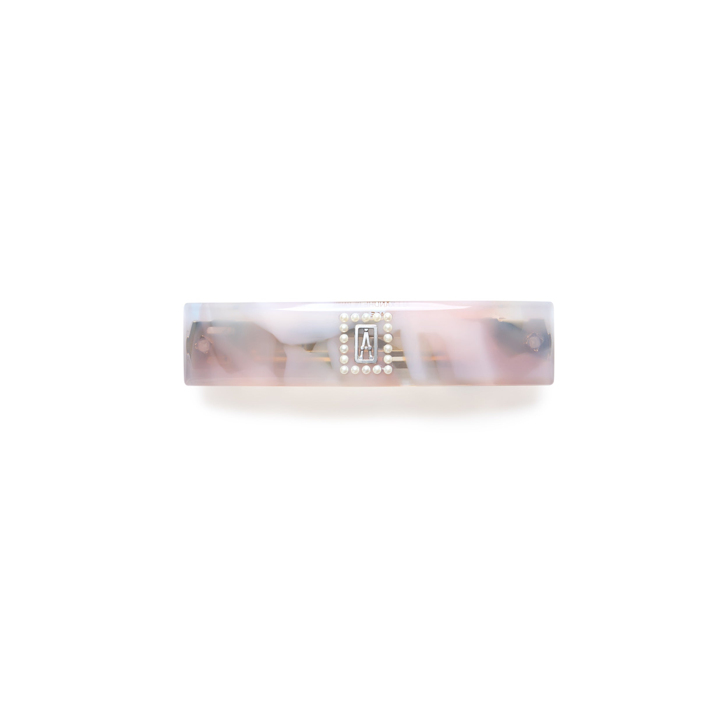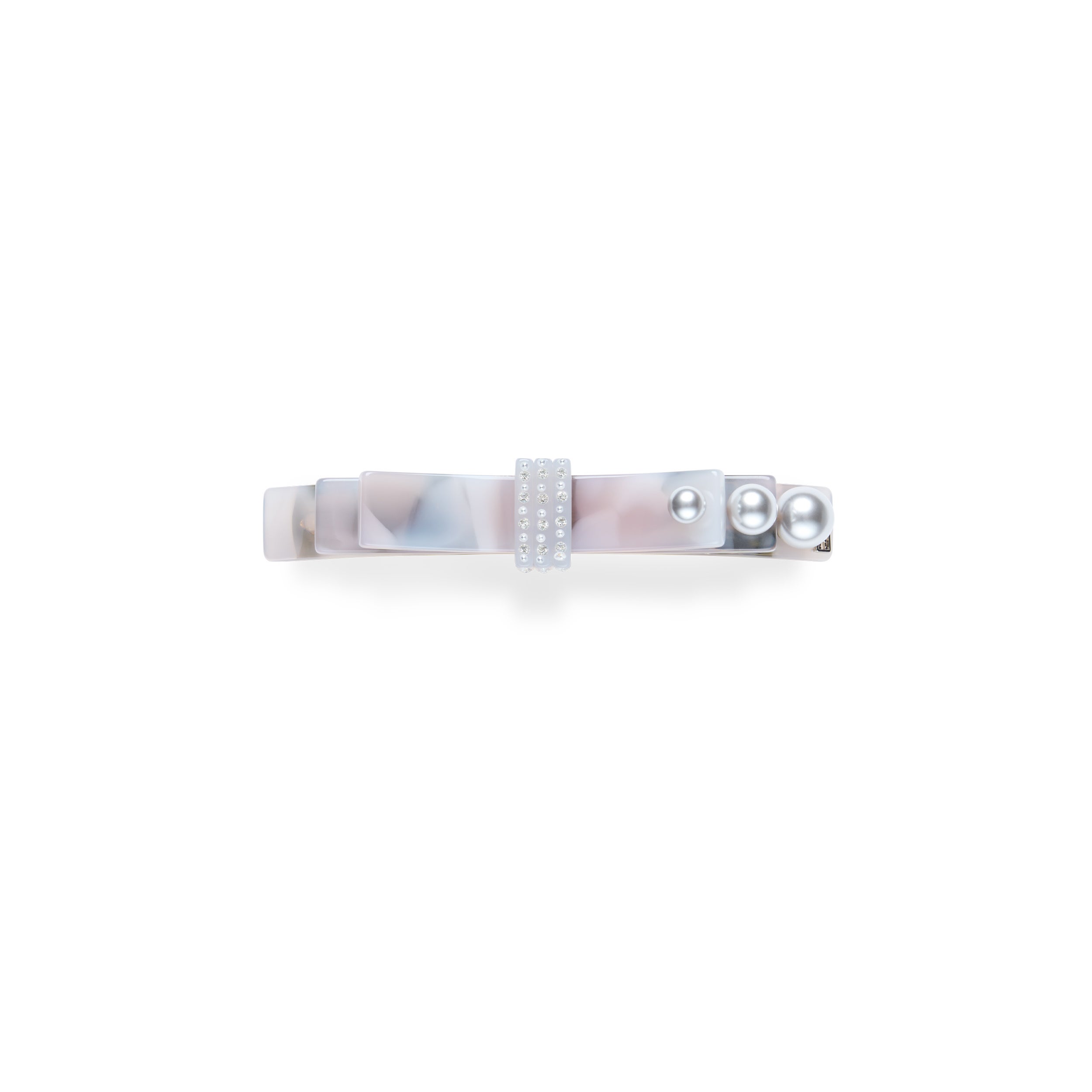 印象派の絵画作品から出てきたような、透明感と繊細な優雅さを楽しめるバレッタ。美しいマーブルパターンのクリアアセテートは、1つ1つ模様が異なるため、一点物として堪能できます。スワロフスキー®・クリスタル パールで囲んだセンターのビッグロゴがコーディネートをモダンに昇華し、普段のスタイルも格上げしてくれるアイテムです。