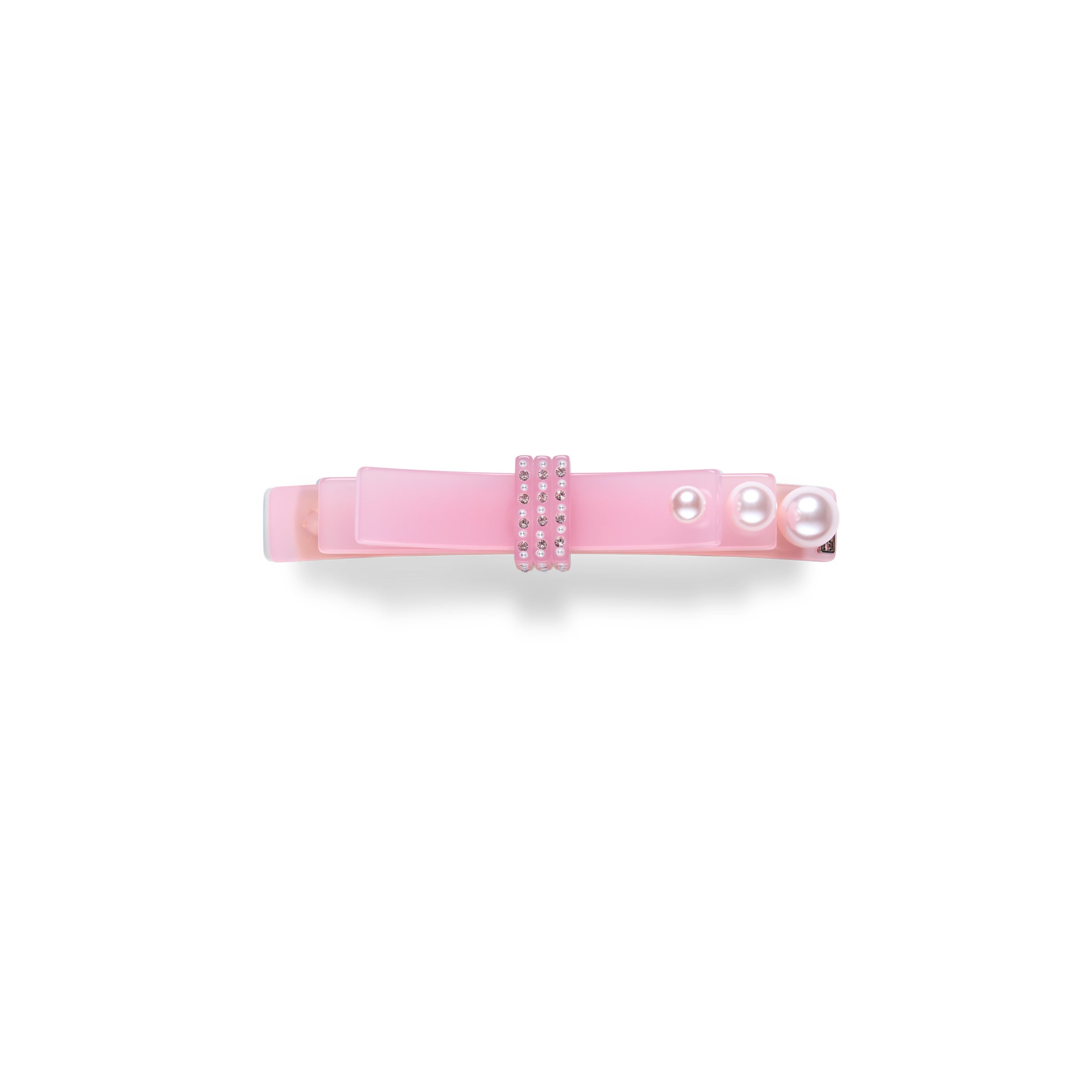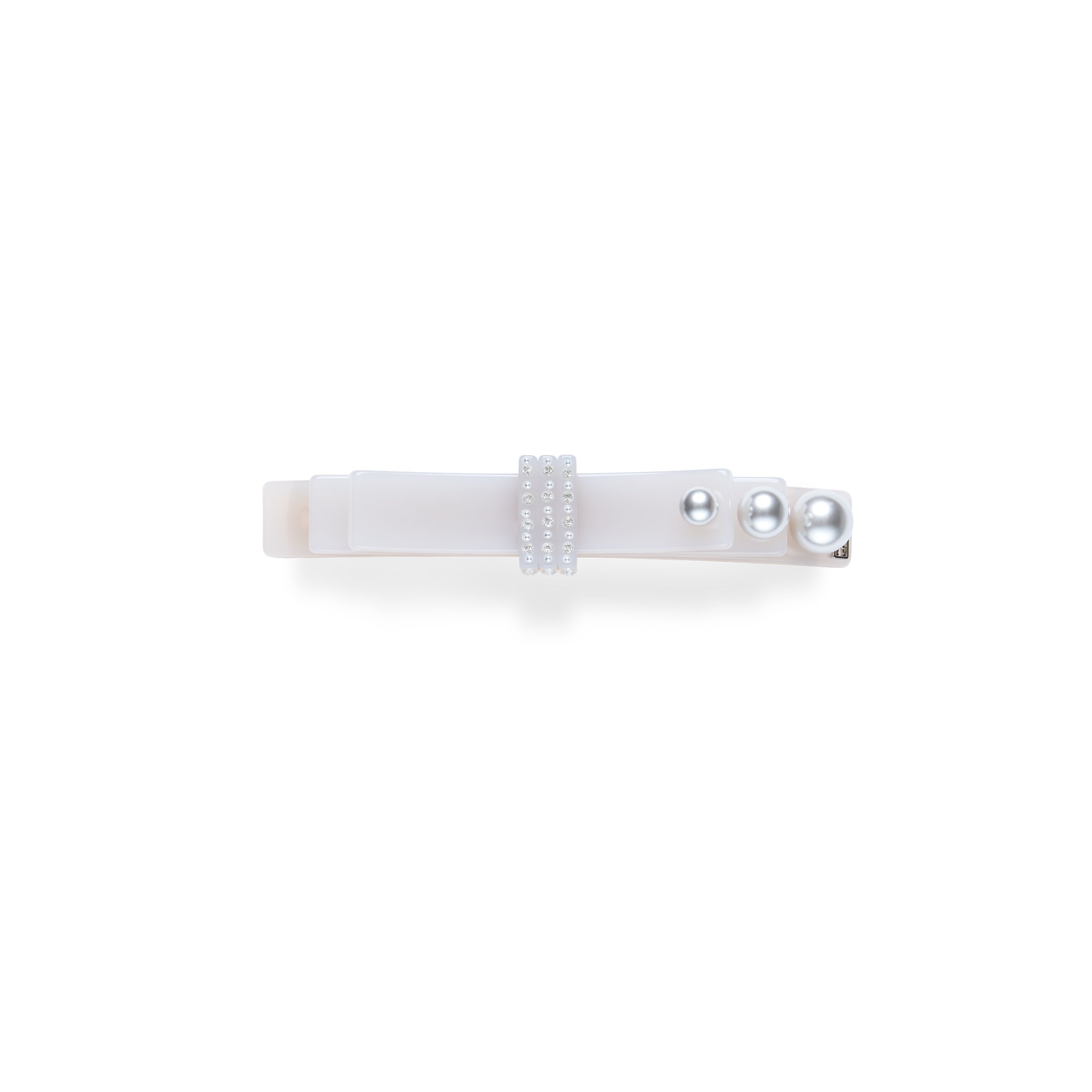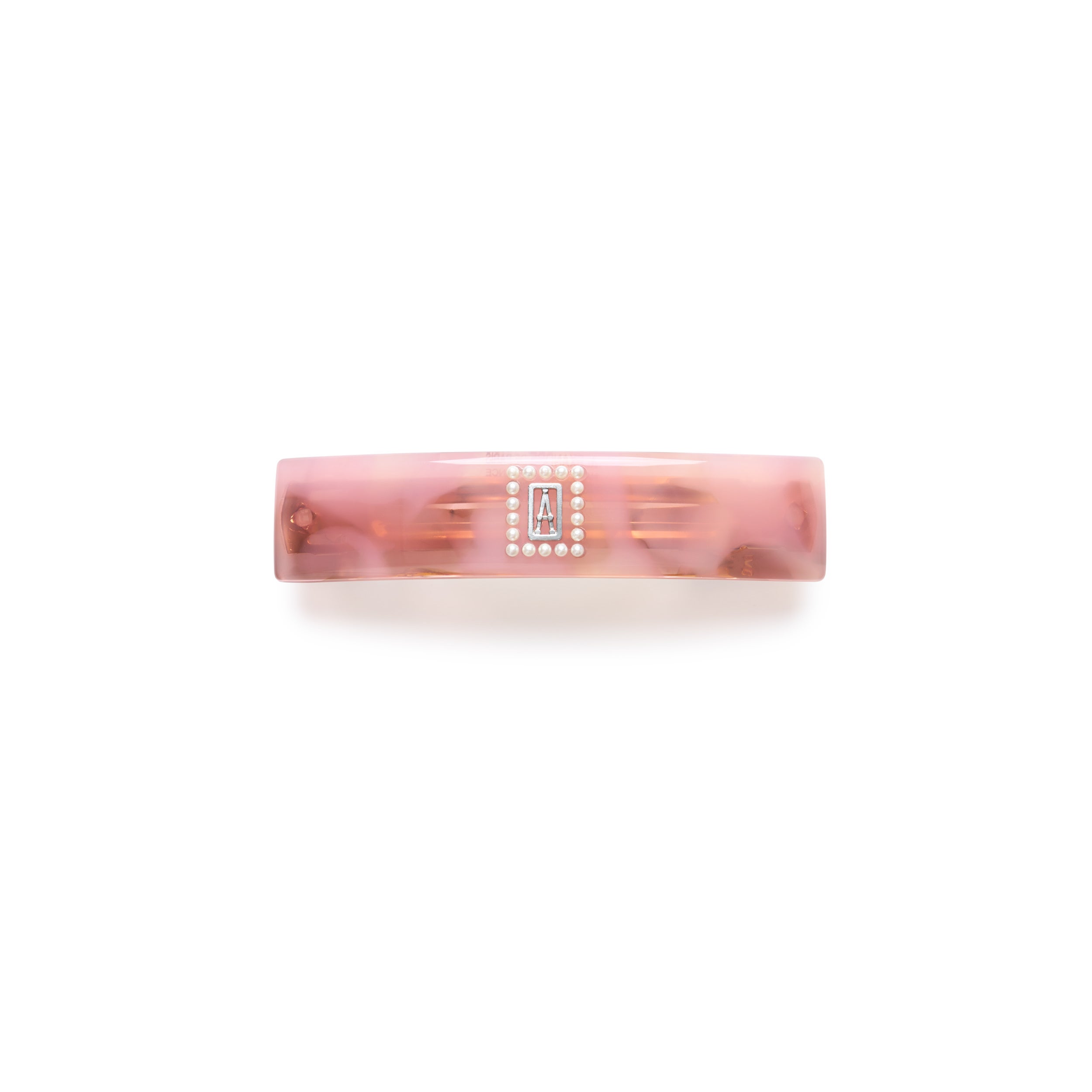印象派の絵画作品から出てきたような、透明感と繊細な優雅さを楽しめるバレッタ。美しいマーブルパターンのクリアアセテートは、1つ1つ模様が異なるため、一点物として堪能できます。スワロフスキー®・クリスタル パールで囲んだセンターのビッグロゴがコーディネートをモダンに昇華し、普段のスタイルも格上げしてくれるアイテムです。
