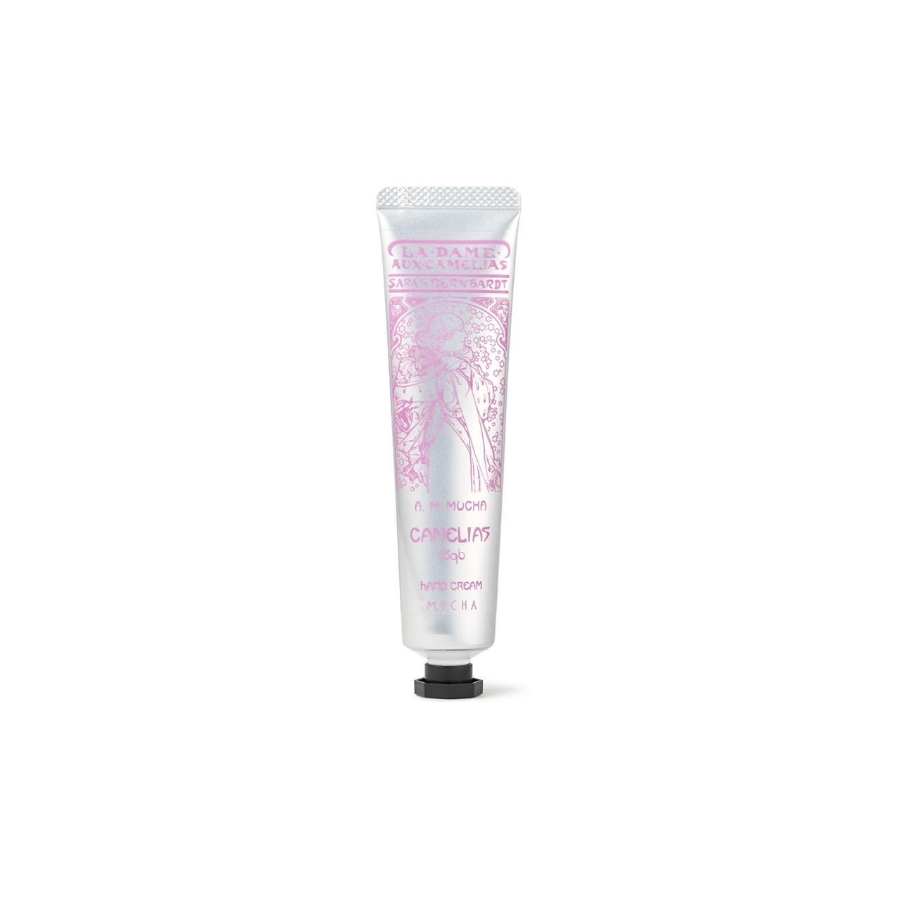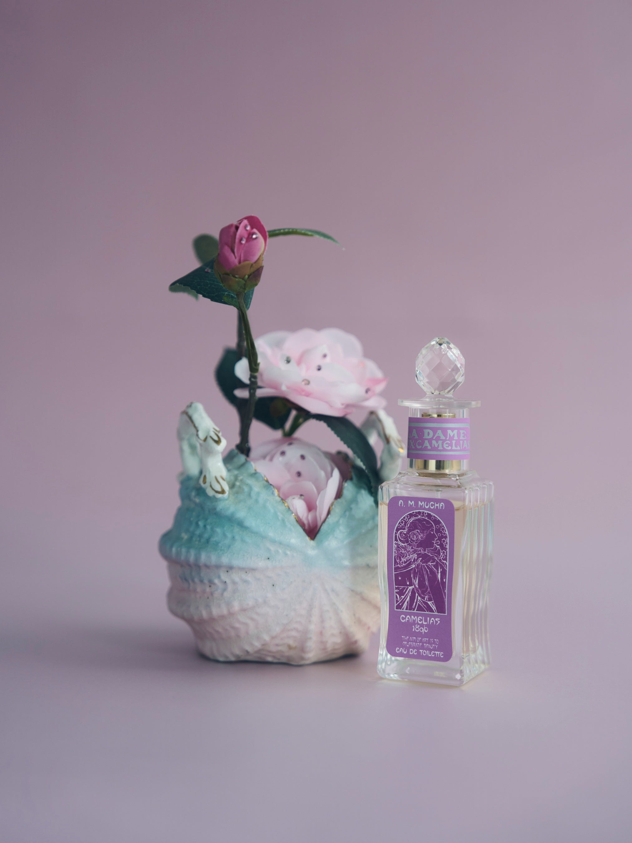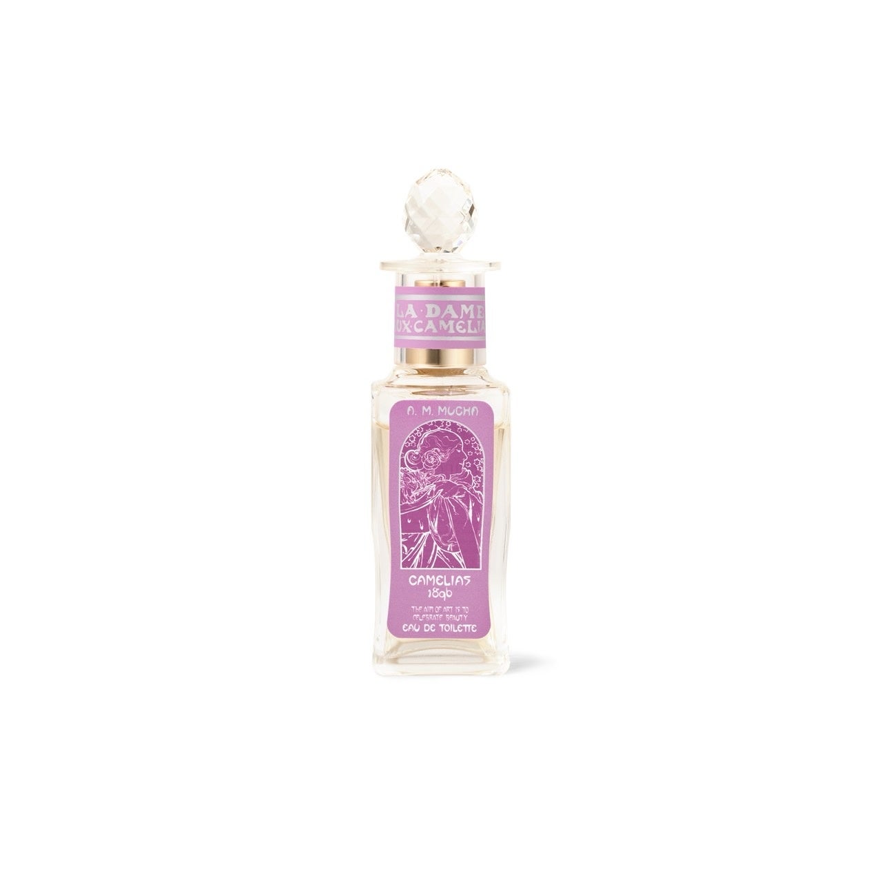 元々は香りを持たない花・カメリアも、ミュシャの描く世界では芳醇なアンバリーフローラルに匂い立ちます。ベルガモットとマンダリンの軽やかなトップノートを束ねるのはイランイランのビターな甘み。そこから次々と浮かび上がるオリエンタルなジャスミン、アイリスにラベンダーは、一夜の夢を思わせるはかない幸福感に満ち足りて。秘められた椿姫の情熱が、私たちをいつもより少しだけ大胆にさせます。目覚めを促すのは、ムスクやトンカビーン、サンダルウッドが織りなすメロウなアンバーウッド。現(うつつ)でもひたむきな愛のちからで、恋する誰かの背中を後押しします。