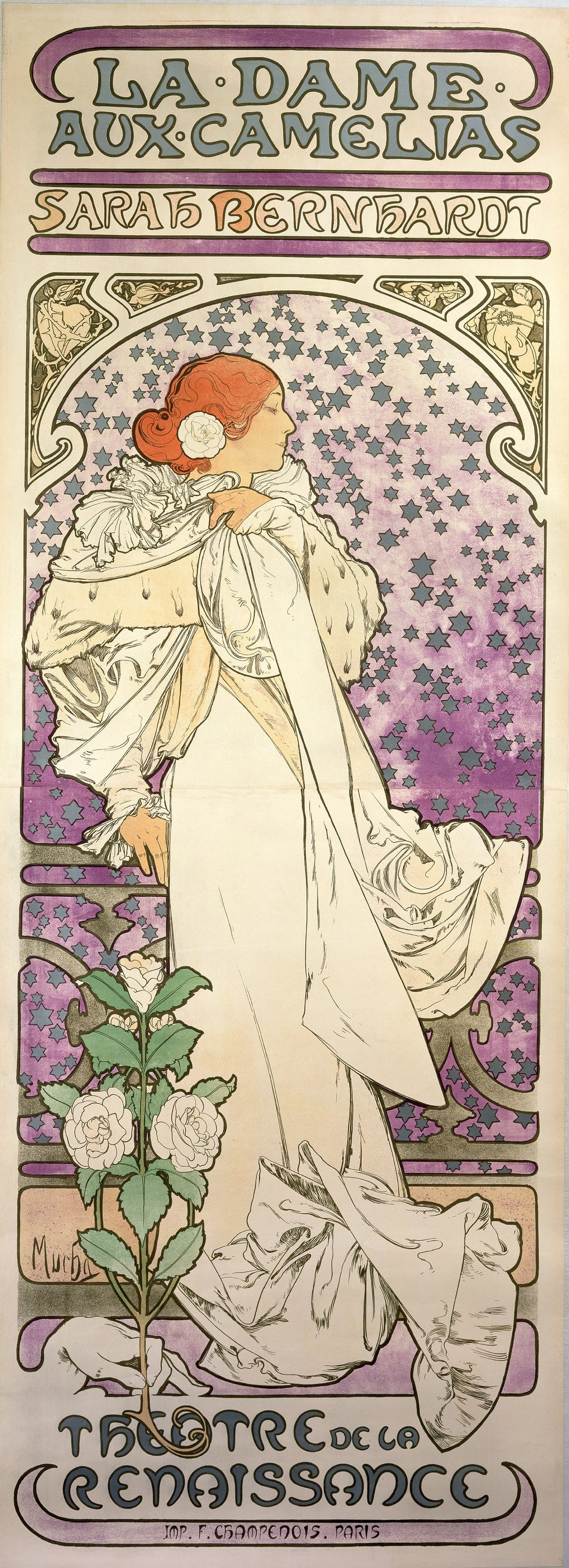 フランスの大女優、サラ・ベルナールのためにミュシャが手がけた2作目のポスターです。アレクサンドル・デュマ(子)の『椿姫』はサラの当たり役で、15年以上もこの役を演じてきました。ミュシャがデザインした当世風の斬新な衣装を纏ったヒロインのたおやかな姿は、気品と清純さに満ち溢れ、銀色の星を背景にテラスにもたれかかりながら、かなわぬ恋に思いをはせています。先品の左下の手に掲げられた椿は生命力に満ち、マルグリットとアルマンの純愛、そして「不屈の美」を表しています。