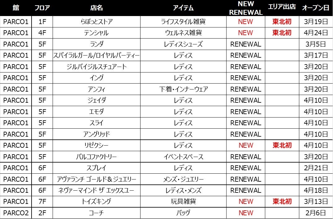 仙台PARCO 2026年春 NEW&RENEWALショップ一覧