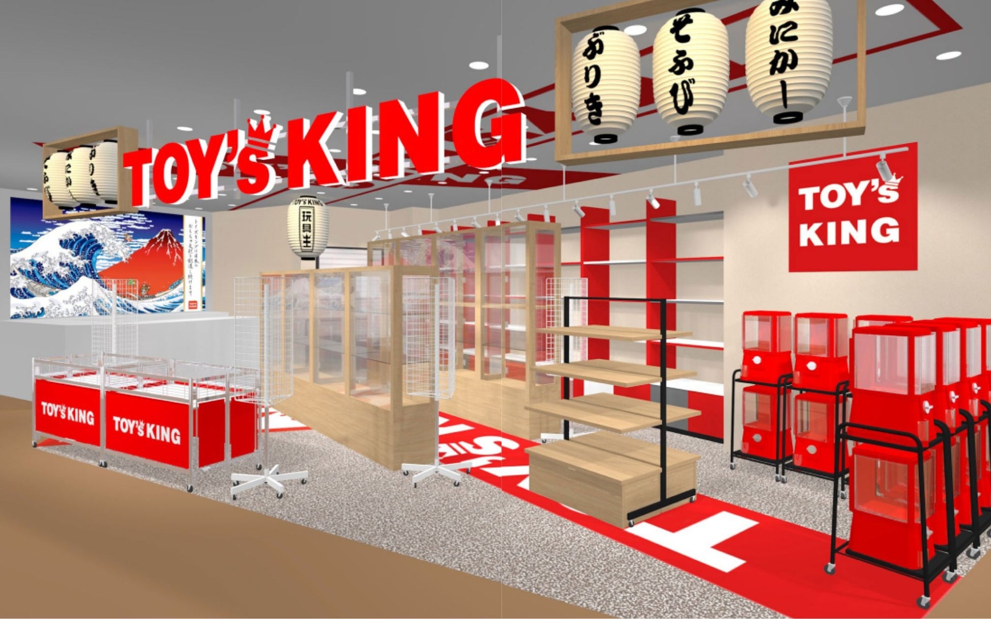 店内は、日本文化を感じる提灯や赤を基調としたデザインで、「見るだけでも楽しい」トイズキングならではの空間に。