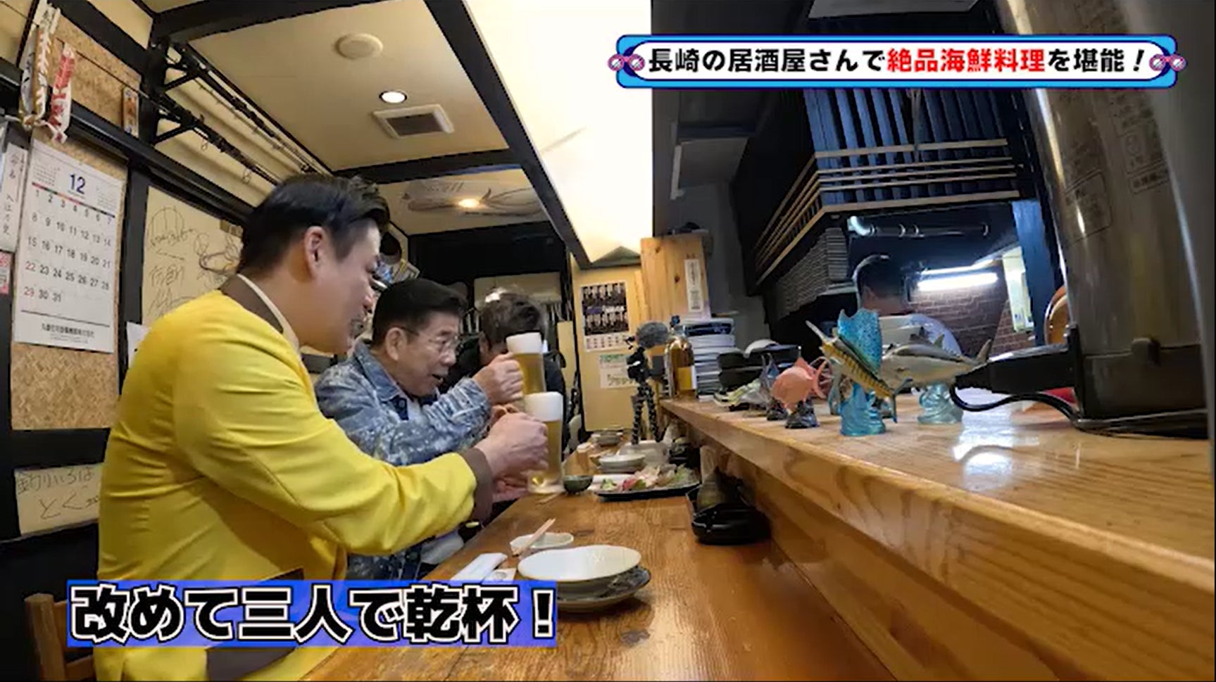その後も、みんなでお酒を飲んだり、きよしとキヨちゃんぽんが「長崎県ウンチク」を出しあったりと、美味しい魚をつまみに和やかな時間が流れます。