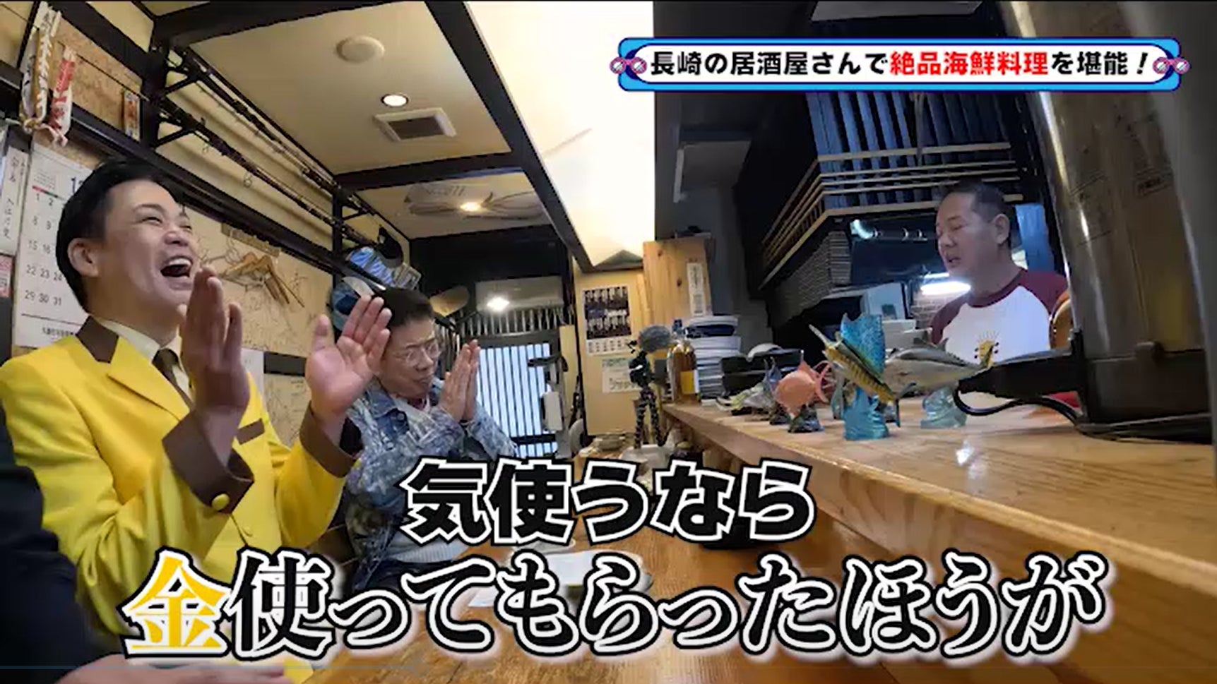 前回に引き続き、ちゃんぽんちからが紹介する「居酒屋こだま」で食事を楽しみます。このお店は、“長崎の魚好きが集まる”という名店。マグロのほほ肉を食べたきよしは、目を見開いて、その美味しさを顔いっぱいに表現します。