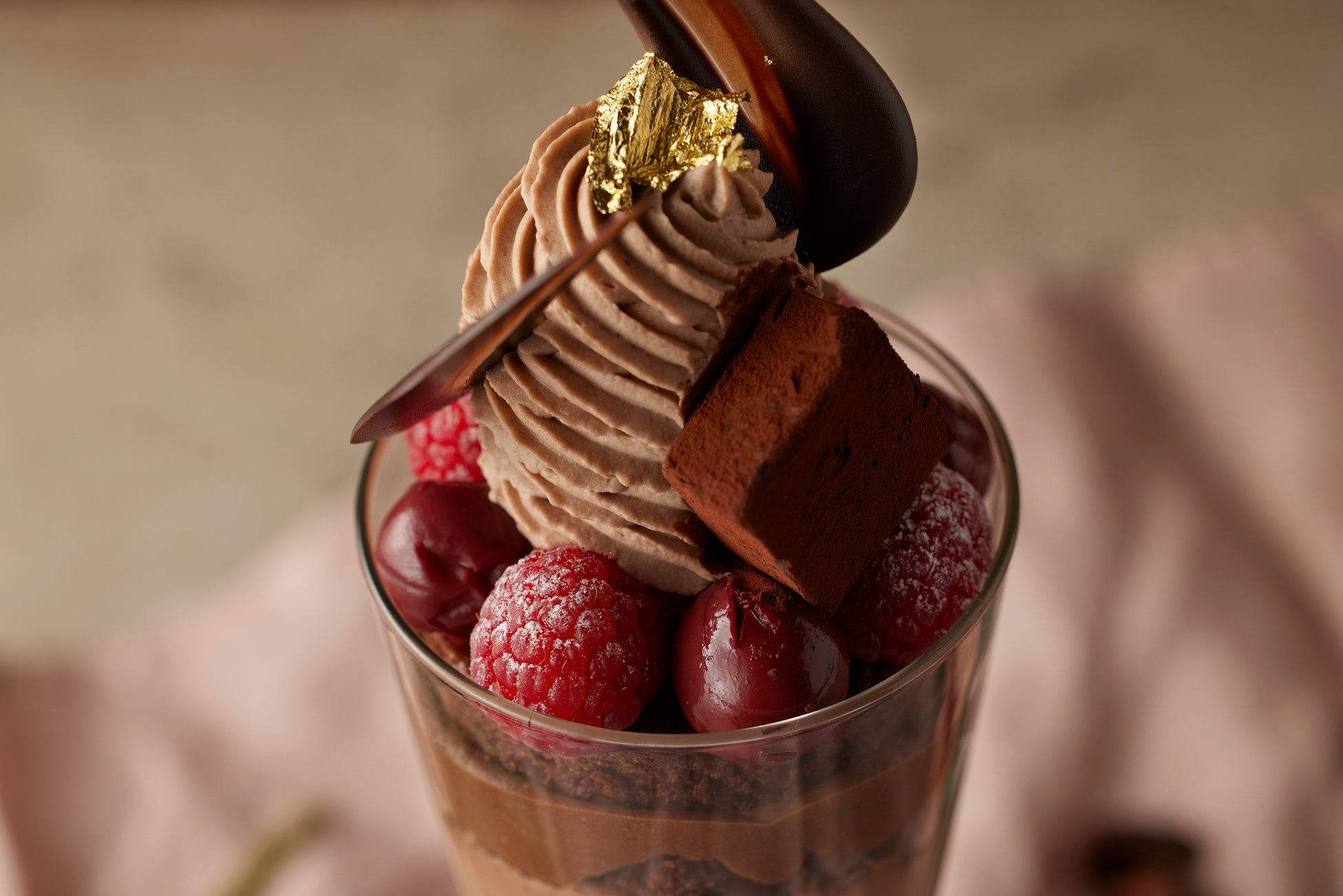 下層は、ほろ苦いコーヒーゼリーとまろやかな甘みのチョコレートパンナコッタを交互に流し込み、4層に仕上げました。その上にチョコレートアイスを重ね、サクサクのサブレとパールクラッカンを食感のアクセントに加えました。さらに、なめらかなチョコレートのカスタードクリームとスポンジを重ね、まるでケーキのような贅沢な味わいを演出。仕上げには、程よい酸味でチョコレートの魅力を引き立てるグリオットチェリーとフランボワーズを添え、チョコレートのシャンティークリームと、とろけるような生チョコレート、金箔を華やかに飾りました。
