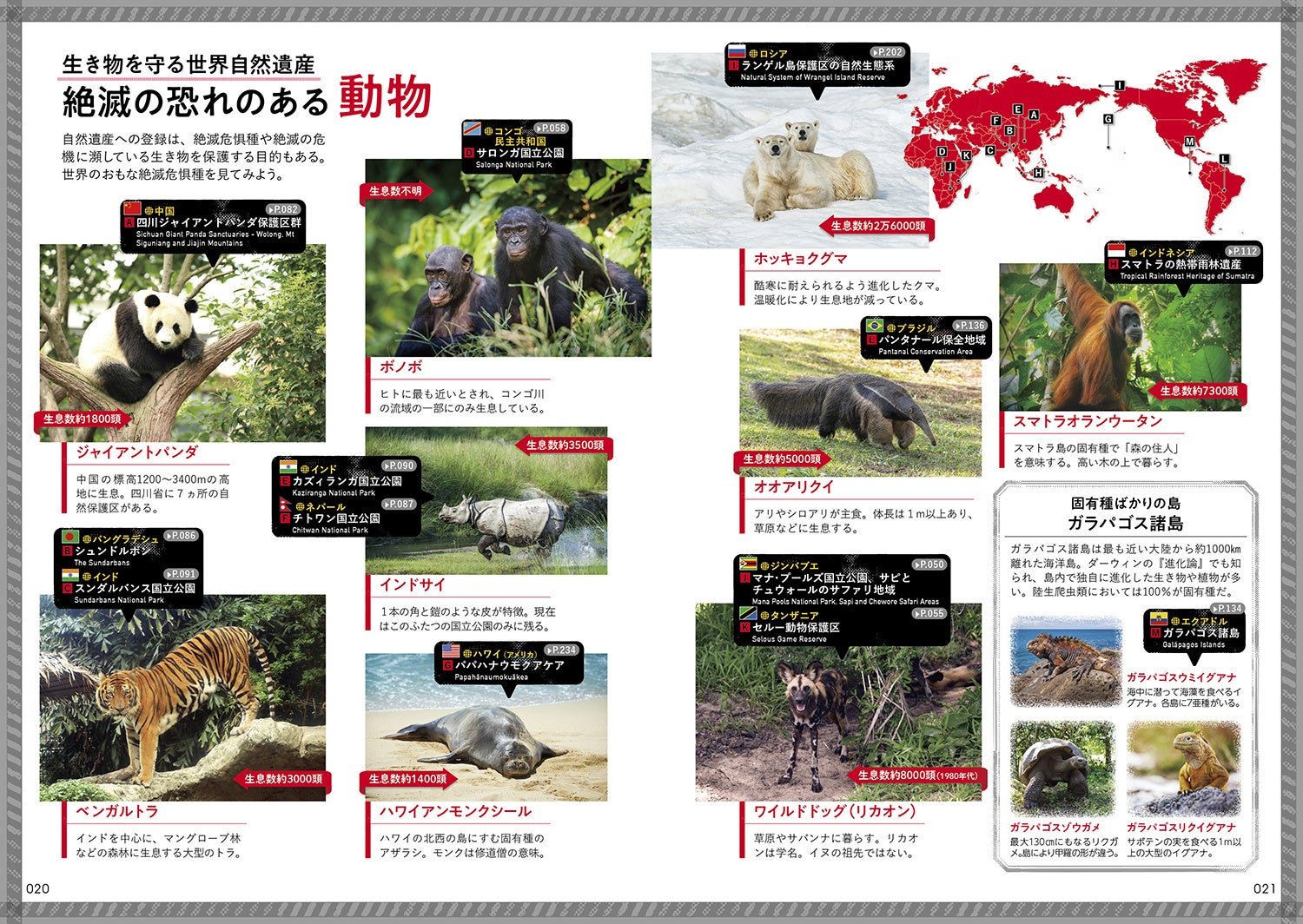 絶滅危惧種を保護する目的もある自然遺産。地球と人類のかけがえのない宝物である世界遺産をさまざまな角度から紹介。国境をまたぐ自然遺産&複合遺産や危機遺産なども掲載