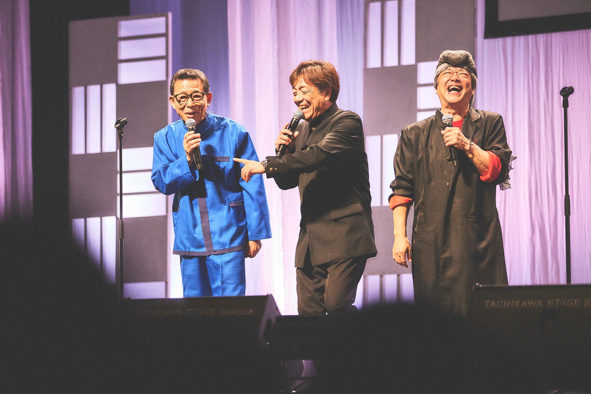 山田がイモ欽トリオに「アイドル?」とイジると、「アイドルだよ!」「バッタモンですからね」「申し訳ないなあ」と、山口良一(ヨシオ)、長江健次(フツオ)、西山浩司(ワルオ)の三者三様なリアクションに観客は大笑い。また、山田が山口に「(明石家)さんまちゃんたちと一緒でしょ? 70歳」と言うと、会場中がお祝いの拍手に包まれます。柏原は西山に「アレ、好きだったんですよ」とリクエストすると、西山が「ミラクル光線~!」とギャグを大サービス。懐かしいトークで大いに盛り上がると、山田が「今日は昭和しばり! ぶっちゃけトークもお願いしますよ」と期待を込めてゲストに声をかけ、コンサートがスタートしました。