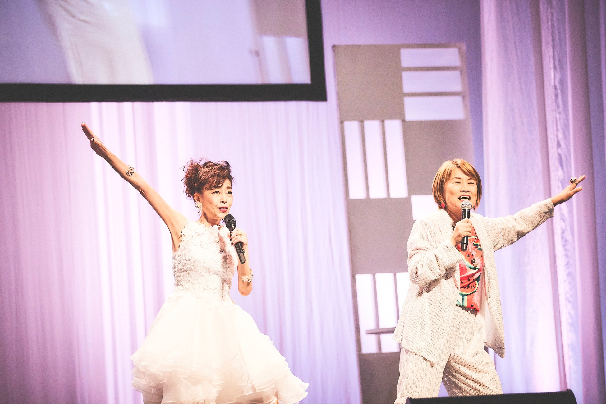 一世を風靡したアイドルグループ・おニャン子クラブの会員番号29番として大人気だった渡辺美奈代はメドレー「乙女心の自由型」「お先に失礼」「恋はくえすちょん」「真赤な自転車メドレー」で観客を魅了。おニャン子クラブの初シングル曲「セーラー服を脱がさないで」は、山田がステージに登場して一緒にダンス。さらに、観客も立ち上がって一緒に踊る姿に「みんなこれ覚えてるね(笑)」と、2人とも感激していました。