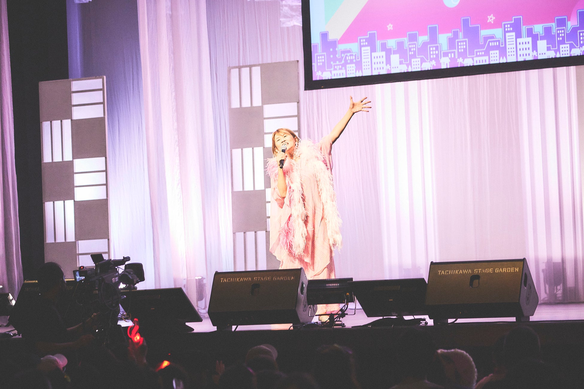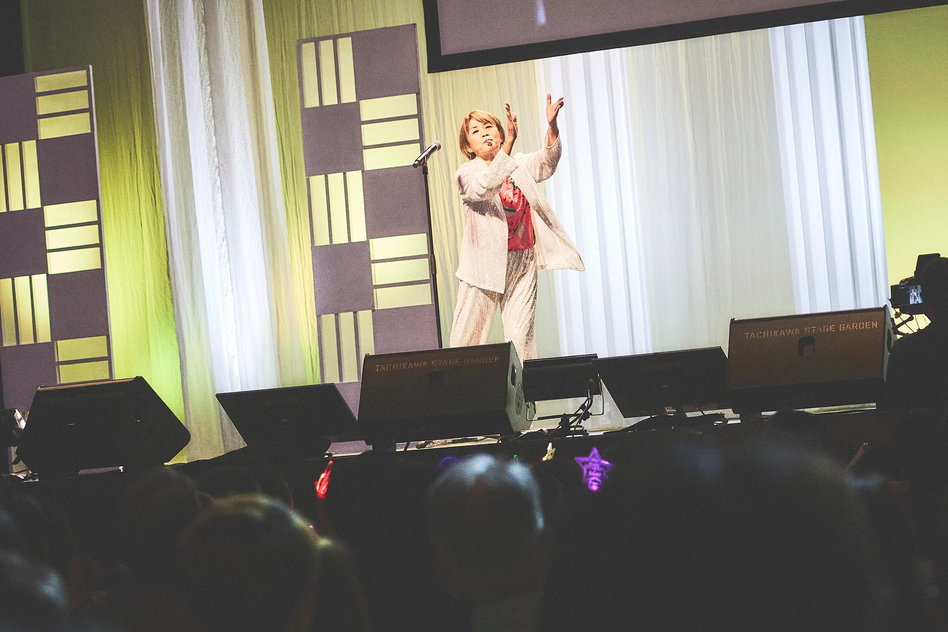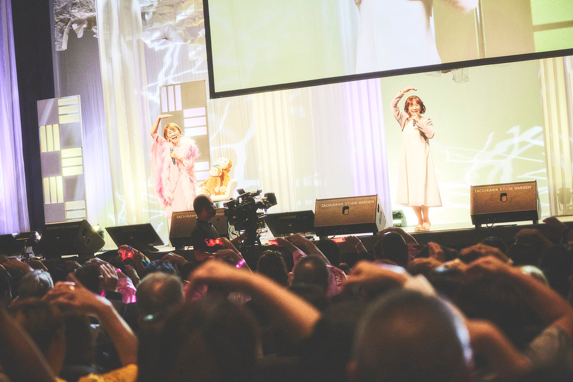 MCの山田は客席を見渡すと「ハチマキをしたり法被を着たりいいですねー!」と大喜び。「アイドルたちを紹介しましょう!」と柏原芳恵、イモ欽トリオ、太田貴子、渡辺美奈代を呼び込むと、観客はペンライトやうちわを振りながら大歓声。オープニングから会場中に熱気があふれます。