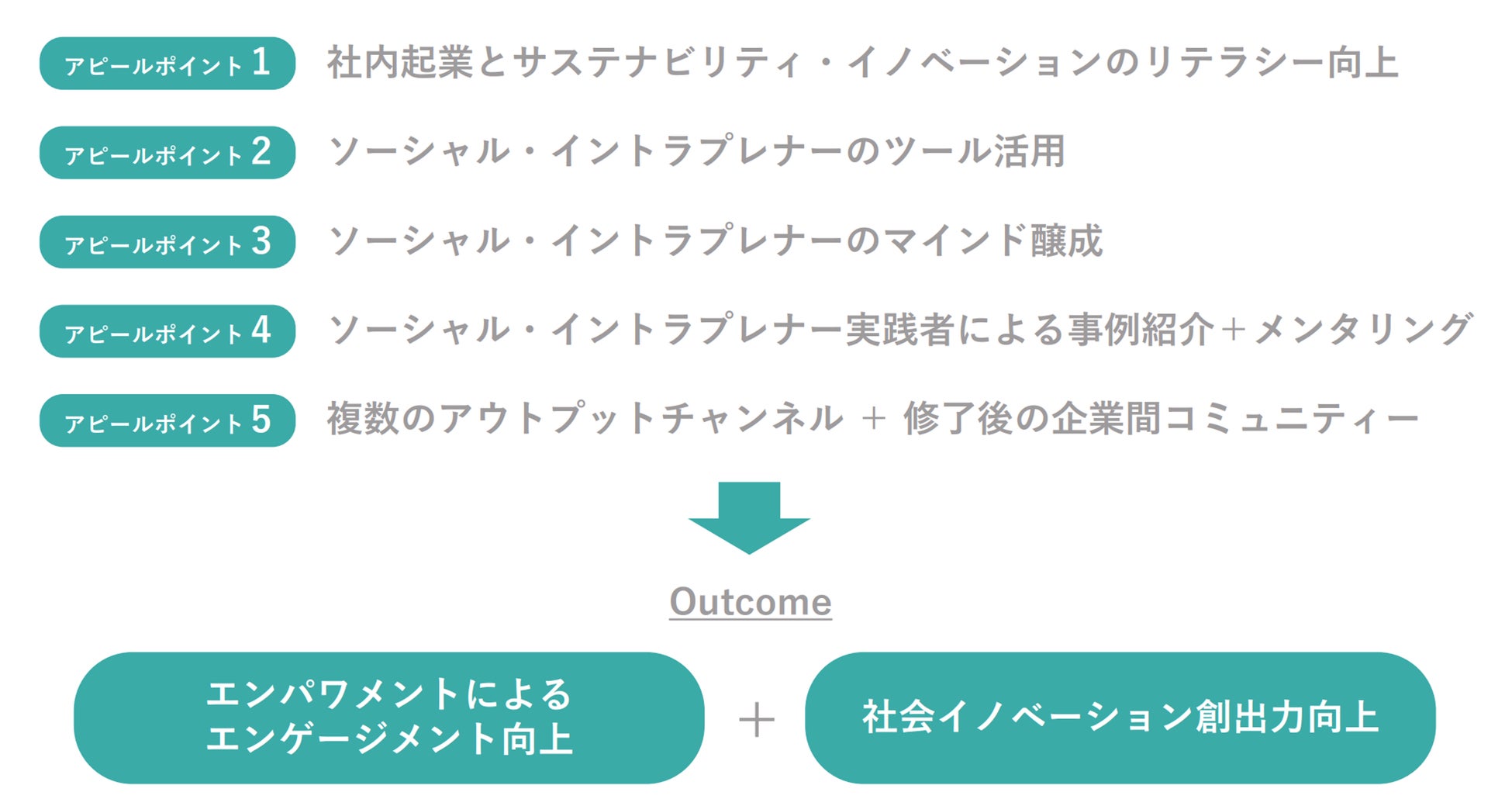 そんな人財を、「ソーシャル・イントラプレナー・スクール」は継続的に輩出し、職場に新しいムードをつくり出すとともに、事業を通じて日本と世界の課題を解決に導ける次世代の社内イノベーターを生み出していきます。