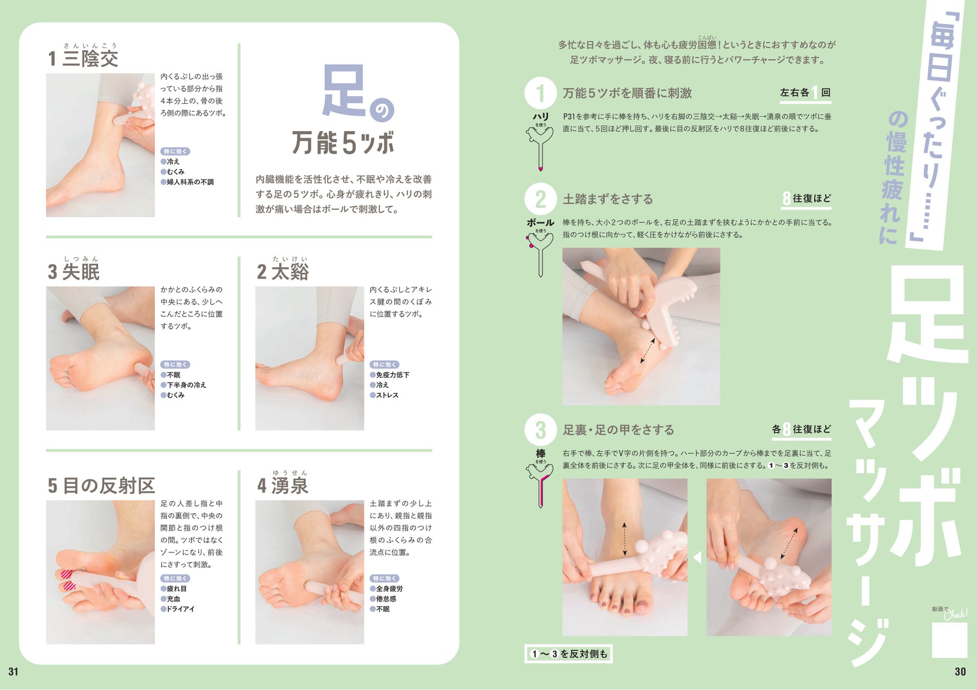スティックの使い方は5通り。ムックではお腹、脚など気になる部位ごとに、スティックを使ったおすすめケアのハウツーを紹介。ページ内にある二次元コードから動画でも見られるので、使い方のコツがわかりやすいのもポイントです。