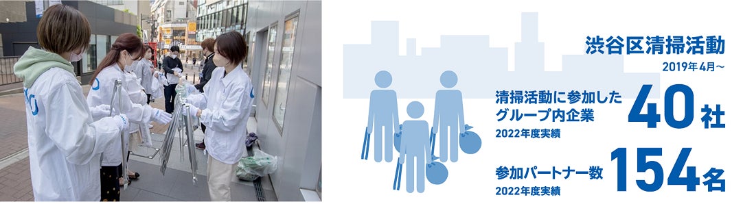 毎年4月に実施される渋谷区一斉清掃活動に参加。独自清掃活動は、コロナ禍による中断はあったものの、2022年4月より、渋谷区に所在する第1本社(渋谷セルリアンタワー)および第2本社(渋谷フクラス)周辺地域において、グループ各社のパートナー(従業員)により実施。地域の方との交流の場にもなっています。(参考:https://www.gmo.jp/csr/sca/20220428/)